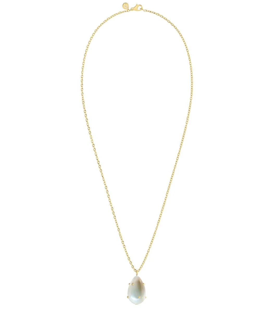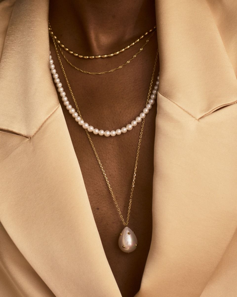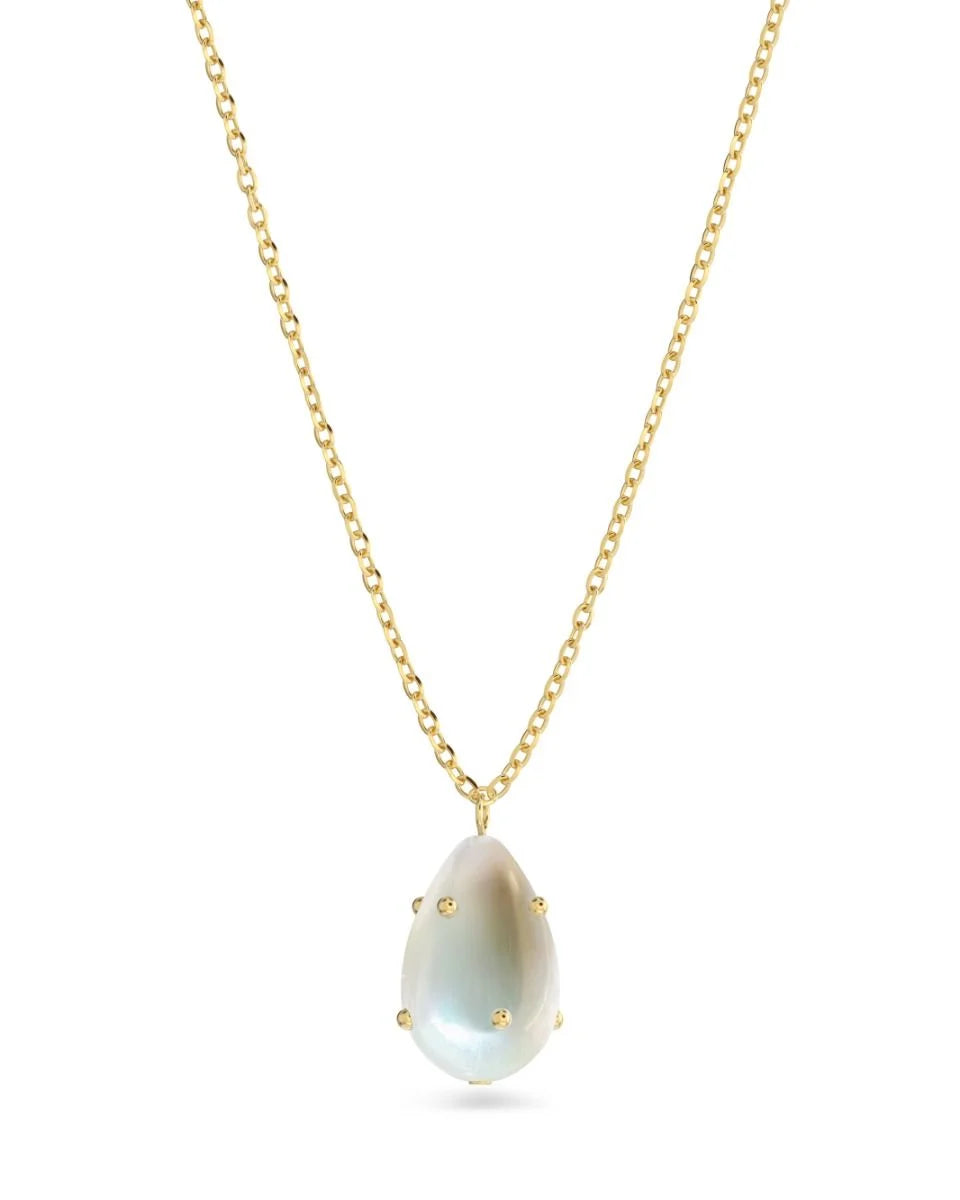 Angeleno Rivet features a stunning teardrop-shaped mother-of-pearl bead that captures the 'pearls meet chain' trend. This stylish necklace showcases metal rivets on the pearl, offering both an elegant and cool look, perfect for everyday wear. The pearl's attachment goes straight through, leaving a small pretty plate at the bottom. The necklace has a bevelled anchor chain, seen here in shiny 14K gold plating. Pair the necklace with Rivets earrings and other pieces from the Angeleno collection for a complete look.