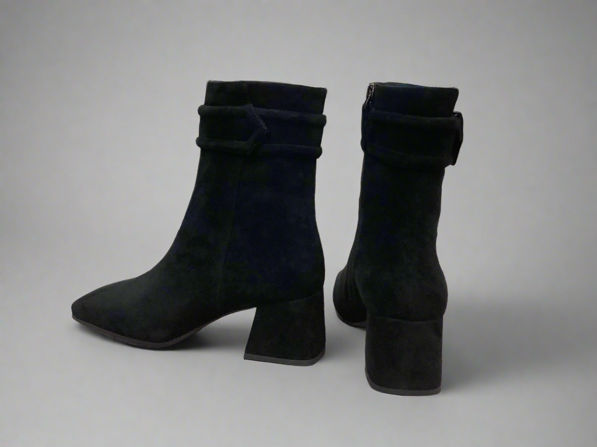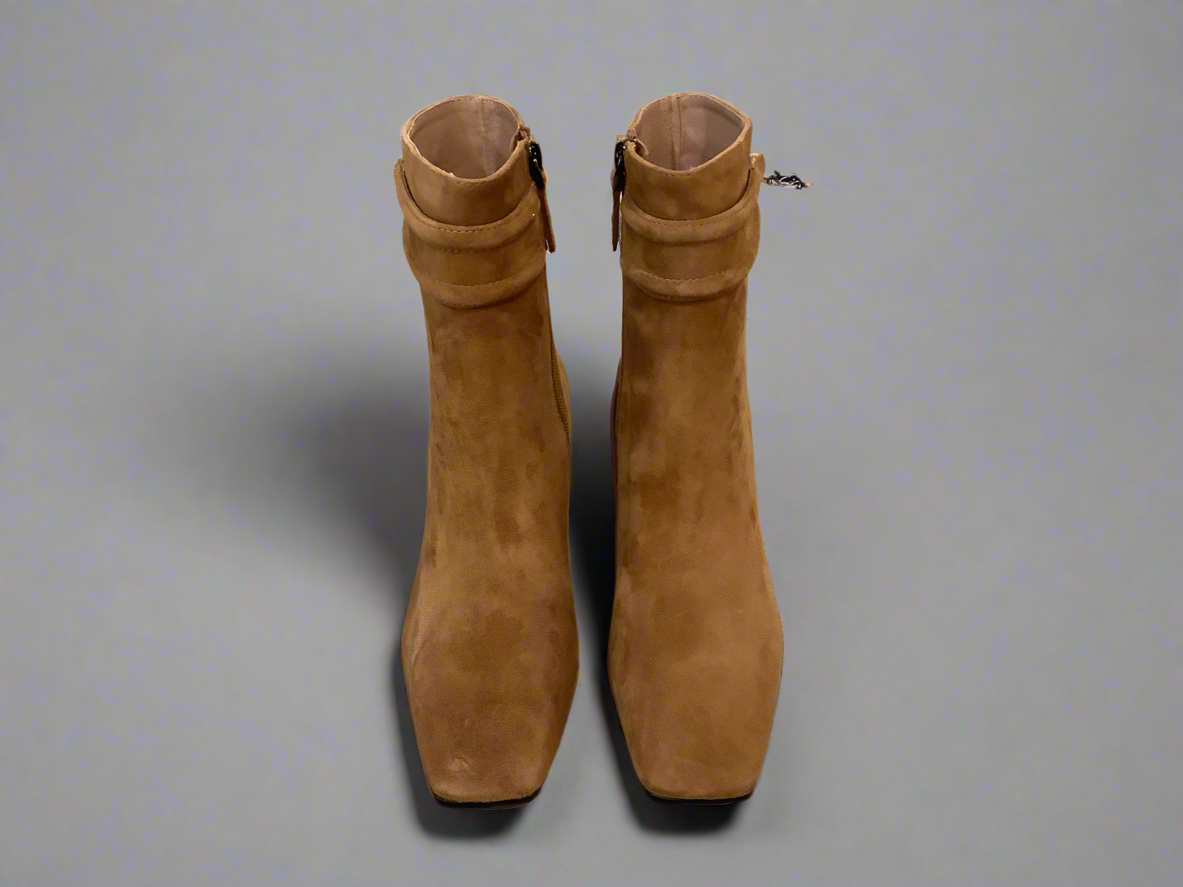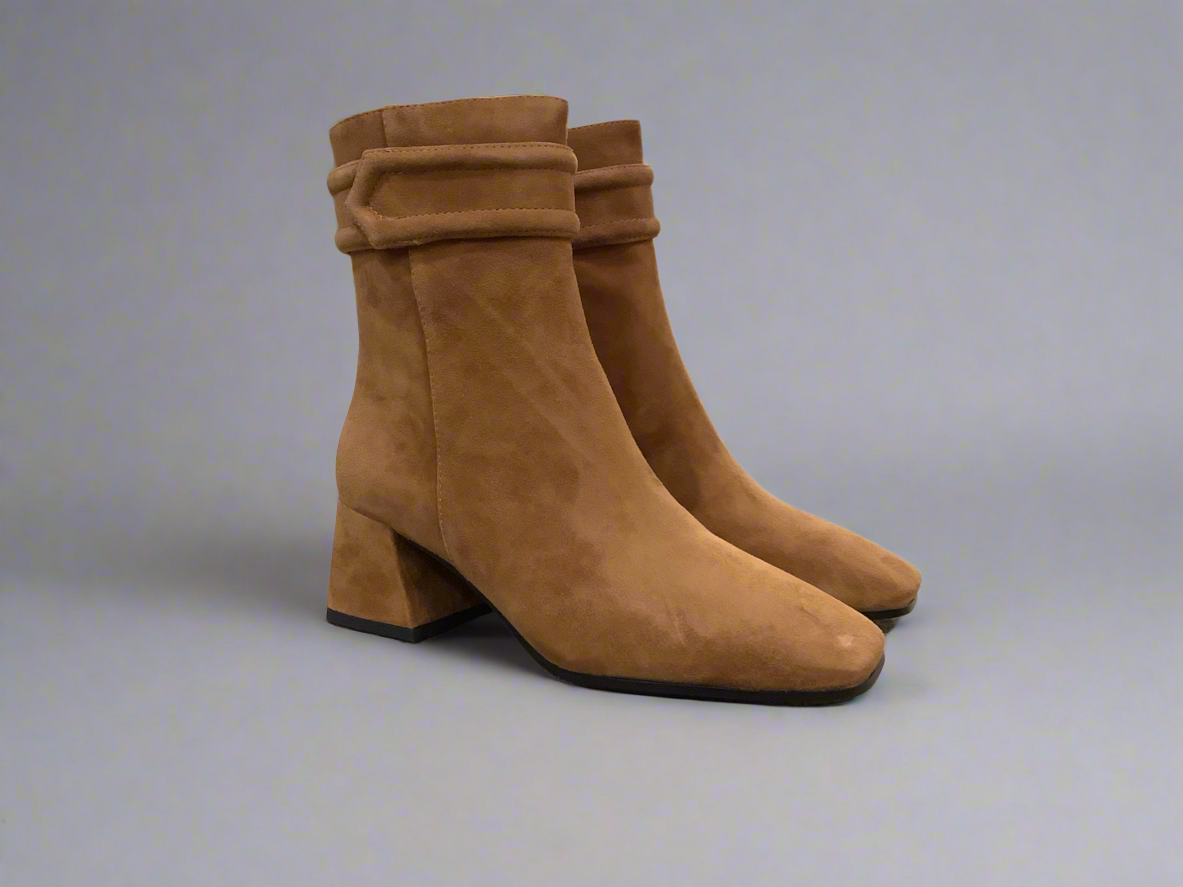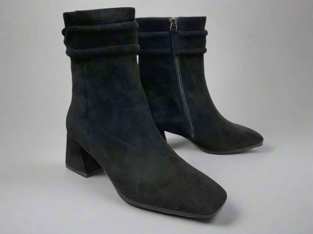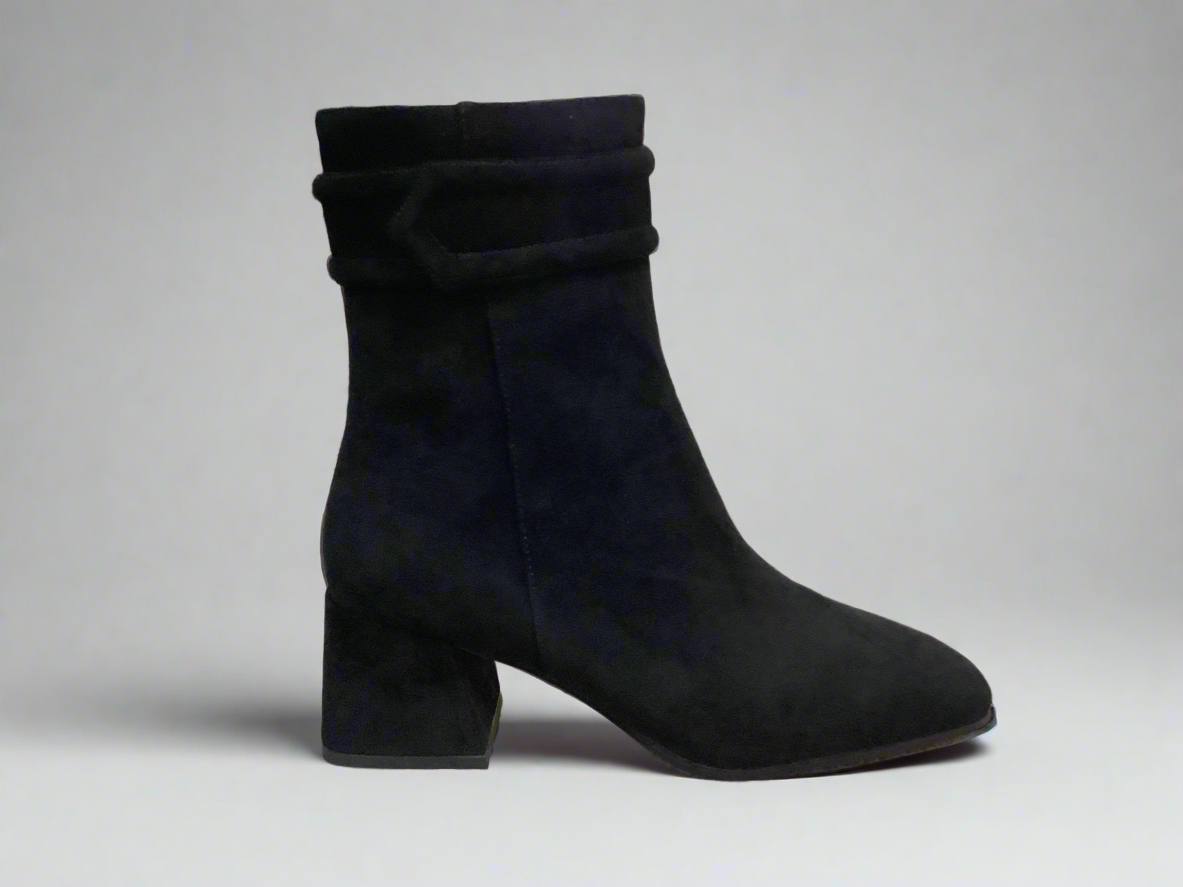 Suede ankle boot with mid block heel. Leather upper with leather lining.
