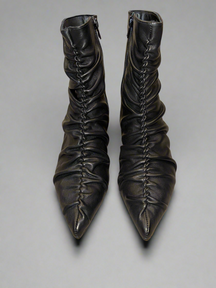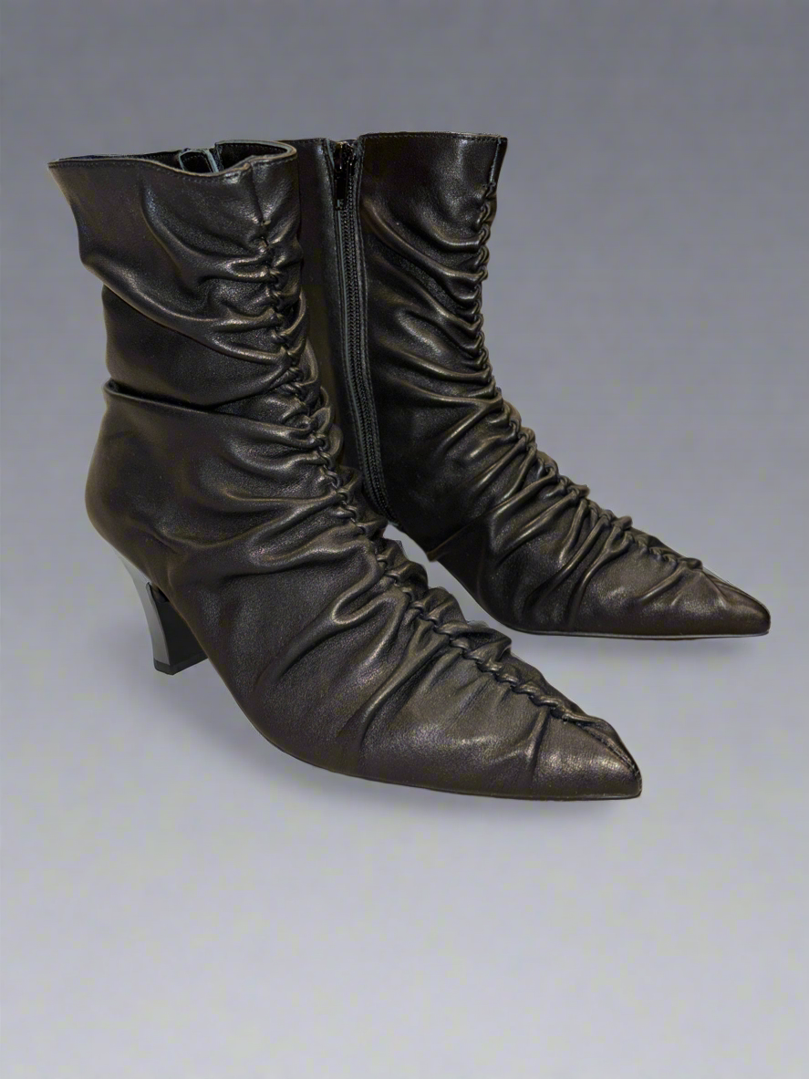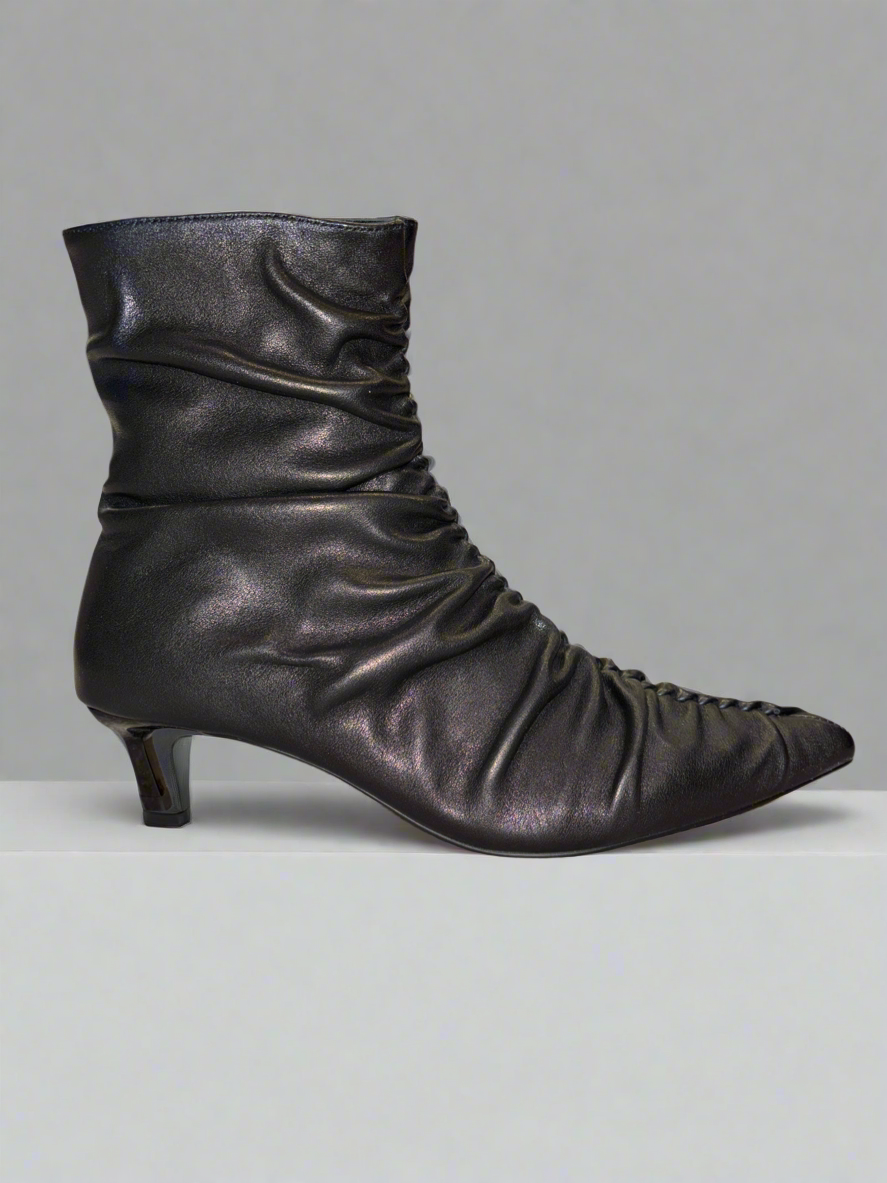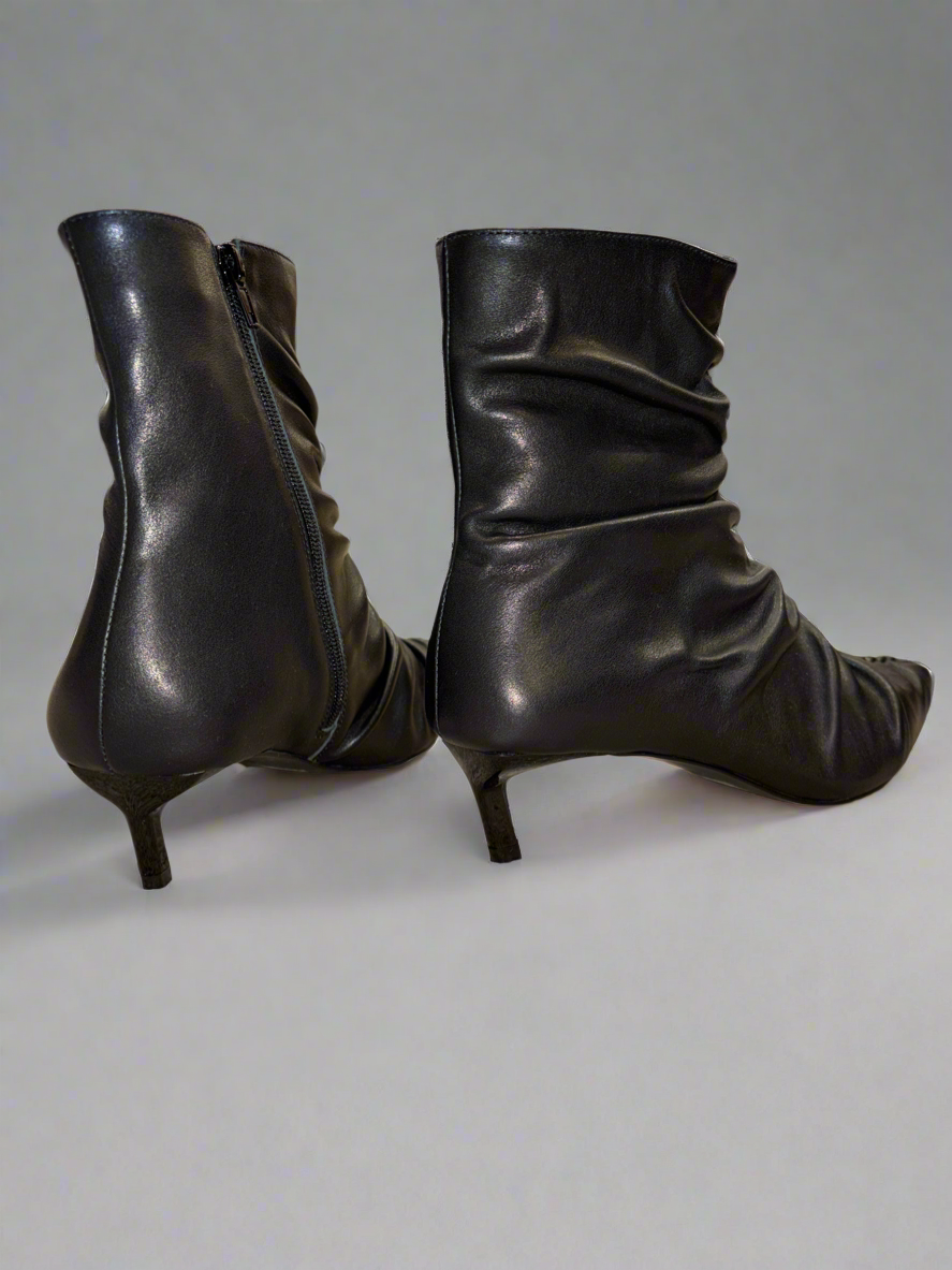 Ruched ankle boot in soft black leather. Non scuff kitten heel.