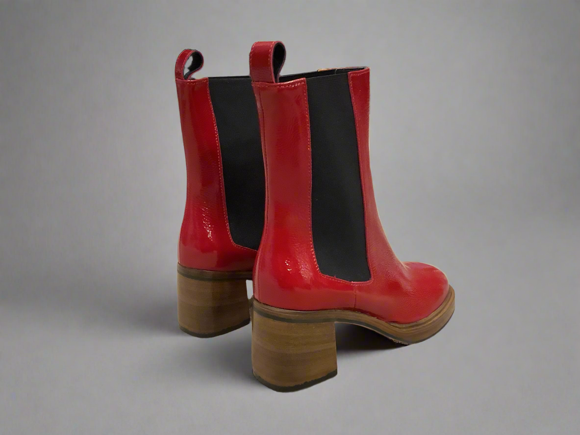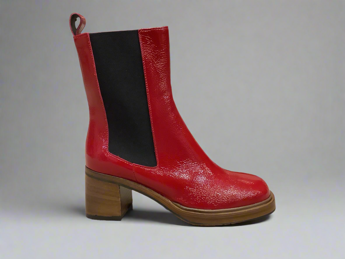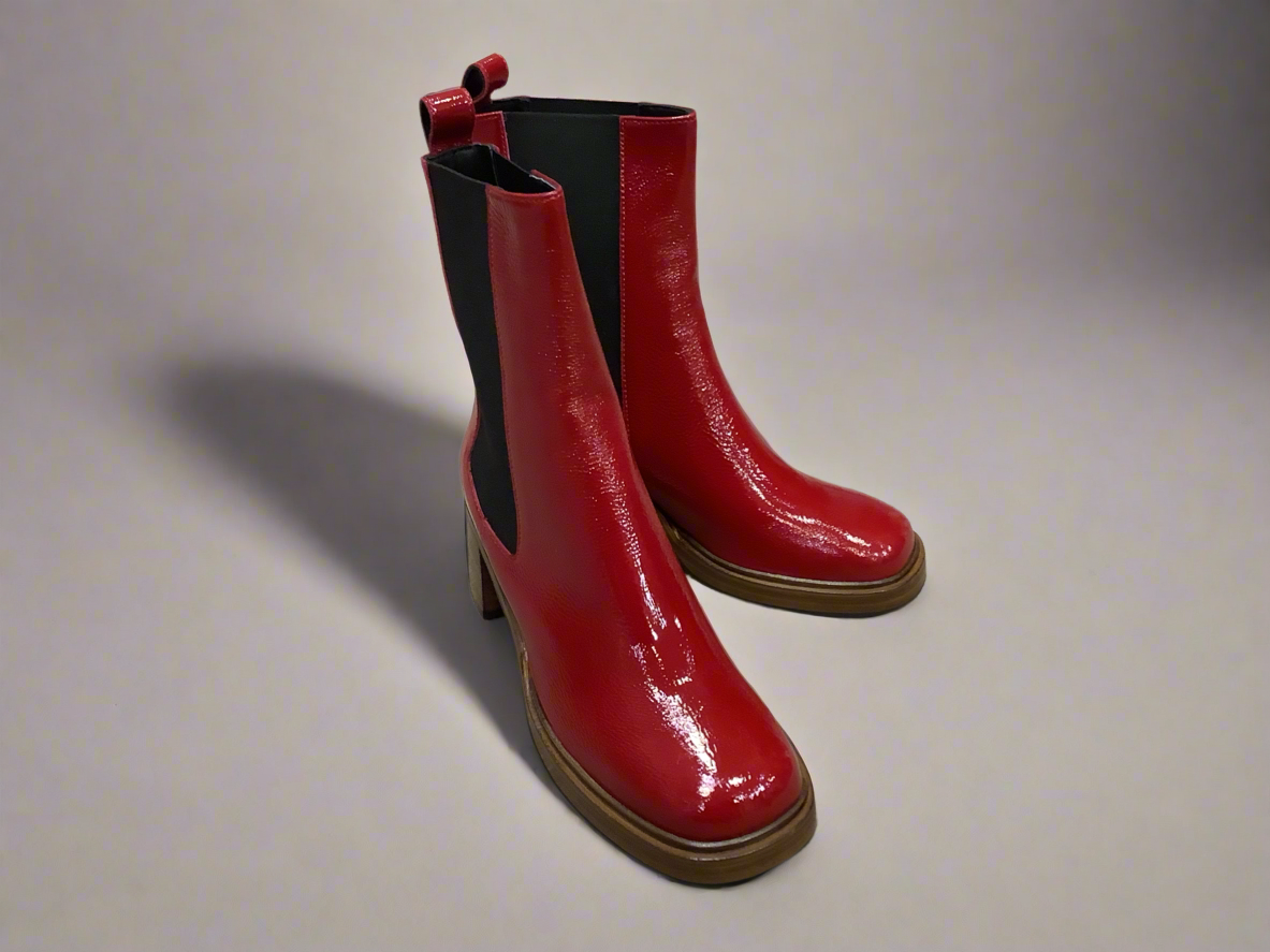 Ankle boot in red patent leather. Pull on tabs with elasticated gusset.