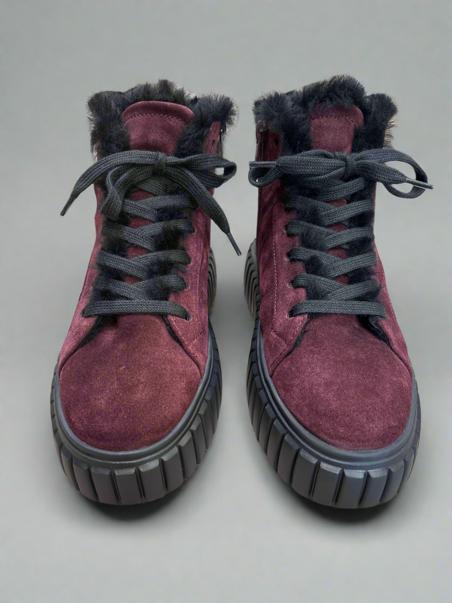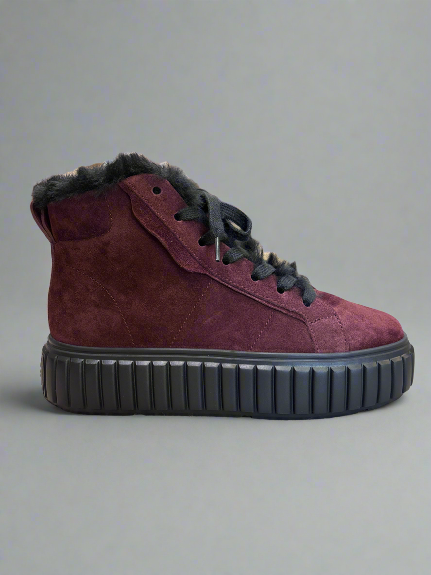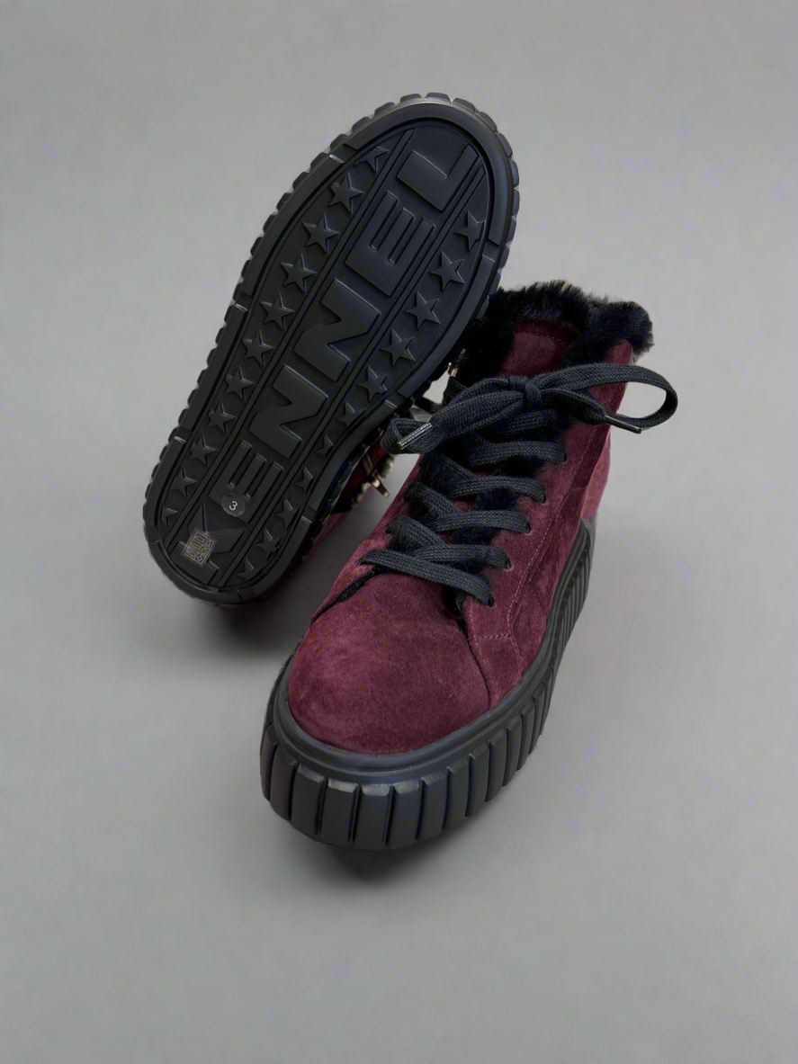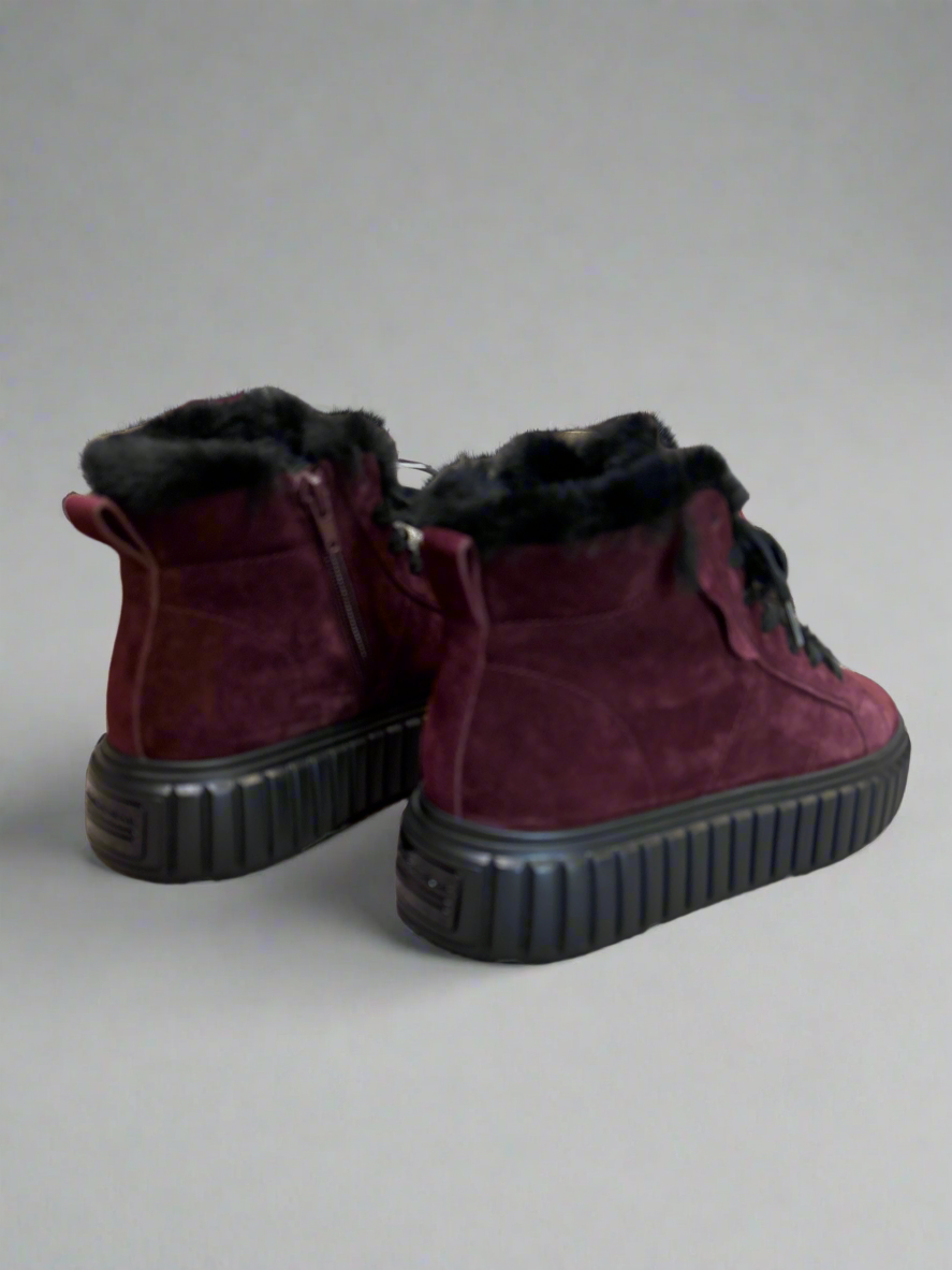 Burgundy Suede Hi-top sneaker in suede with soft sheepskin lining. lace up with inside zip opening.