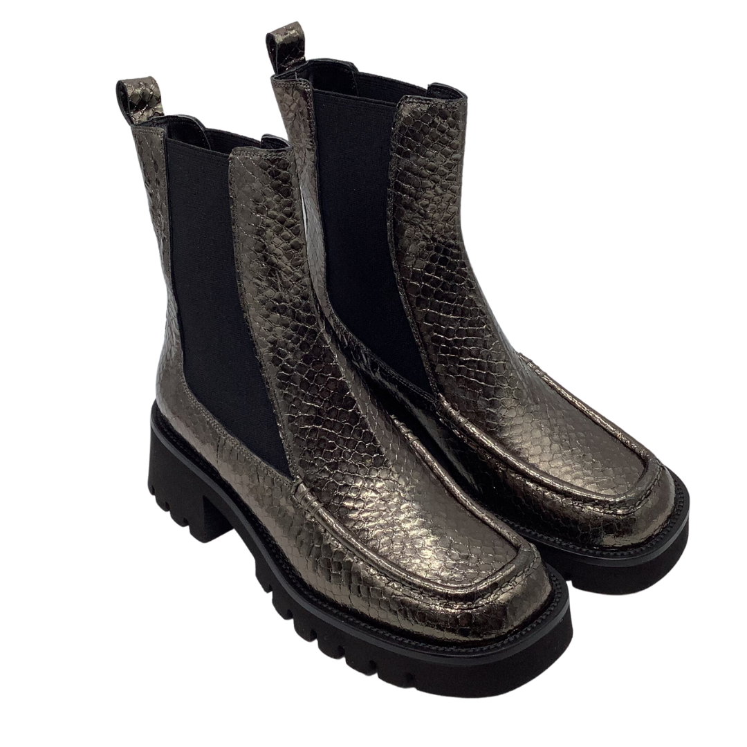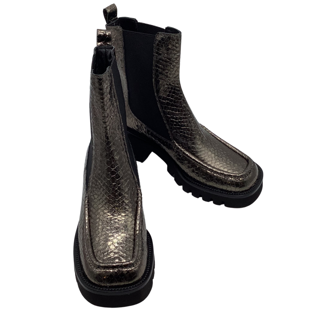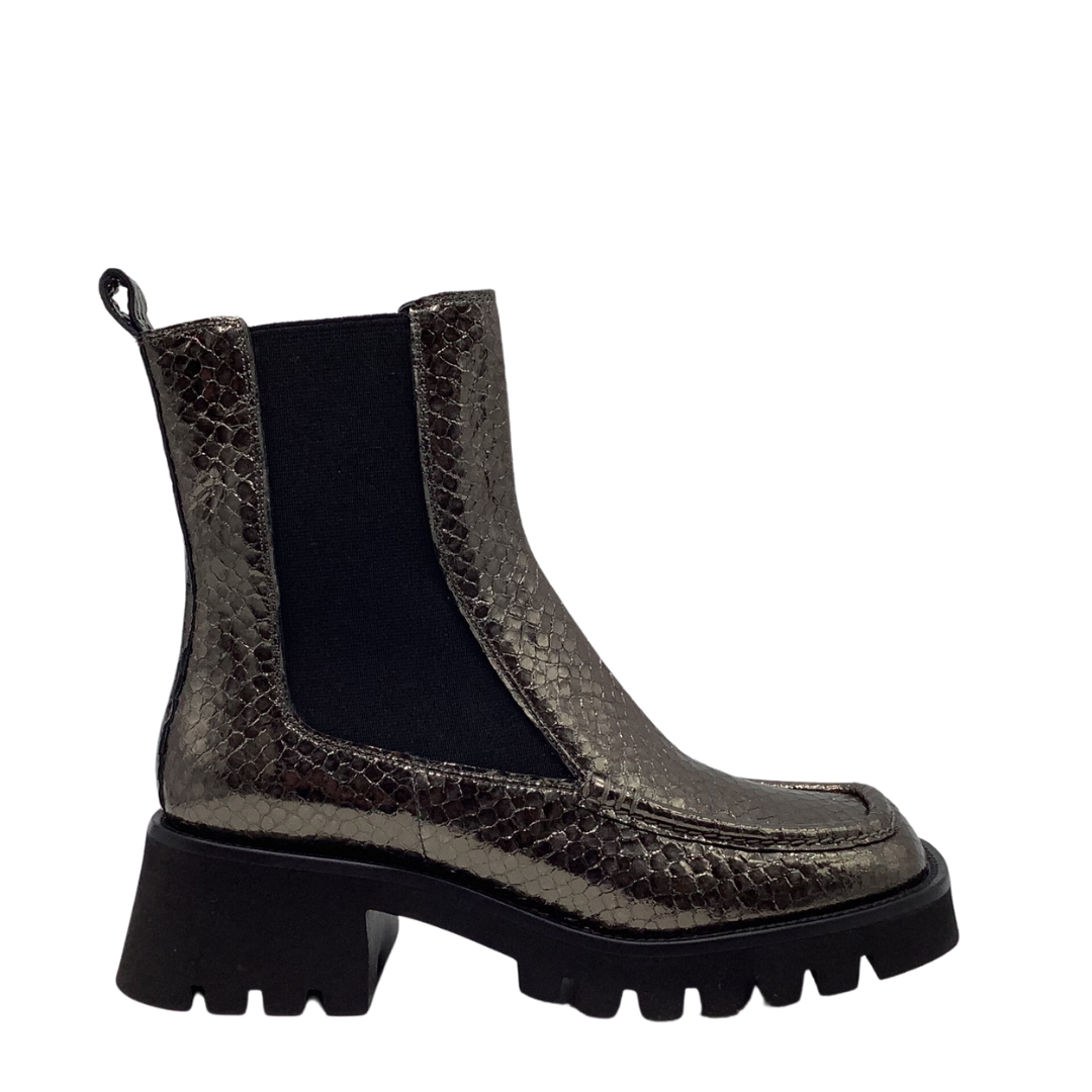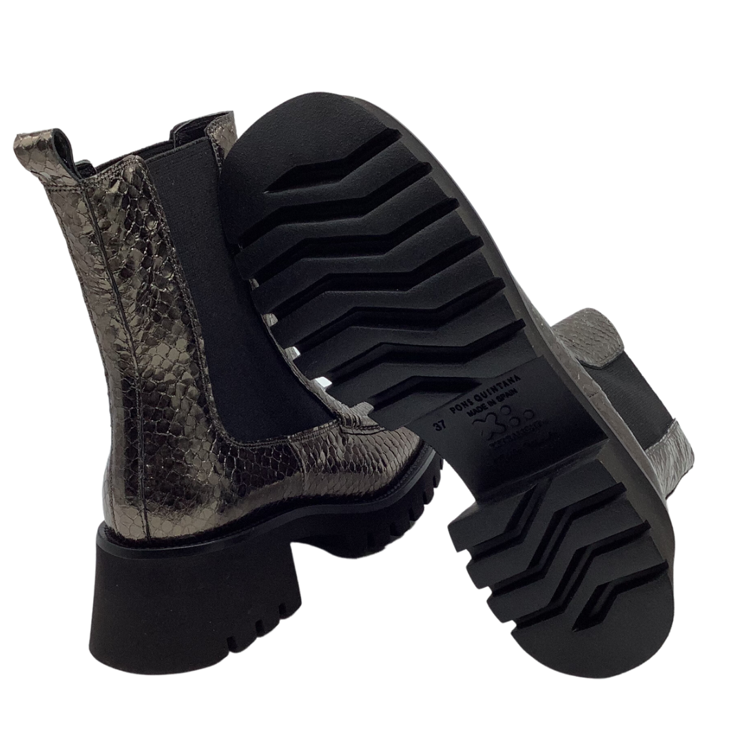 Introducing the Pons Quintana 'Clarissa' Ankle Boot, the perfect blend of luxury, style and sophistication. The chic snake pewter exterior, chunky platform and black elastic panels are crafted into a classic Chelsea boot design, ensuring the utmost comfort. All the elements combine to create an exquisite statement piece that will elevate any look.