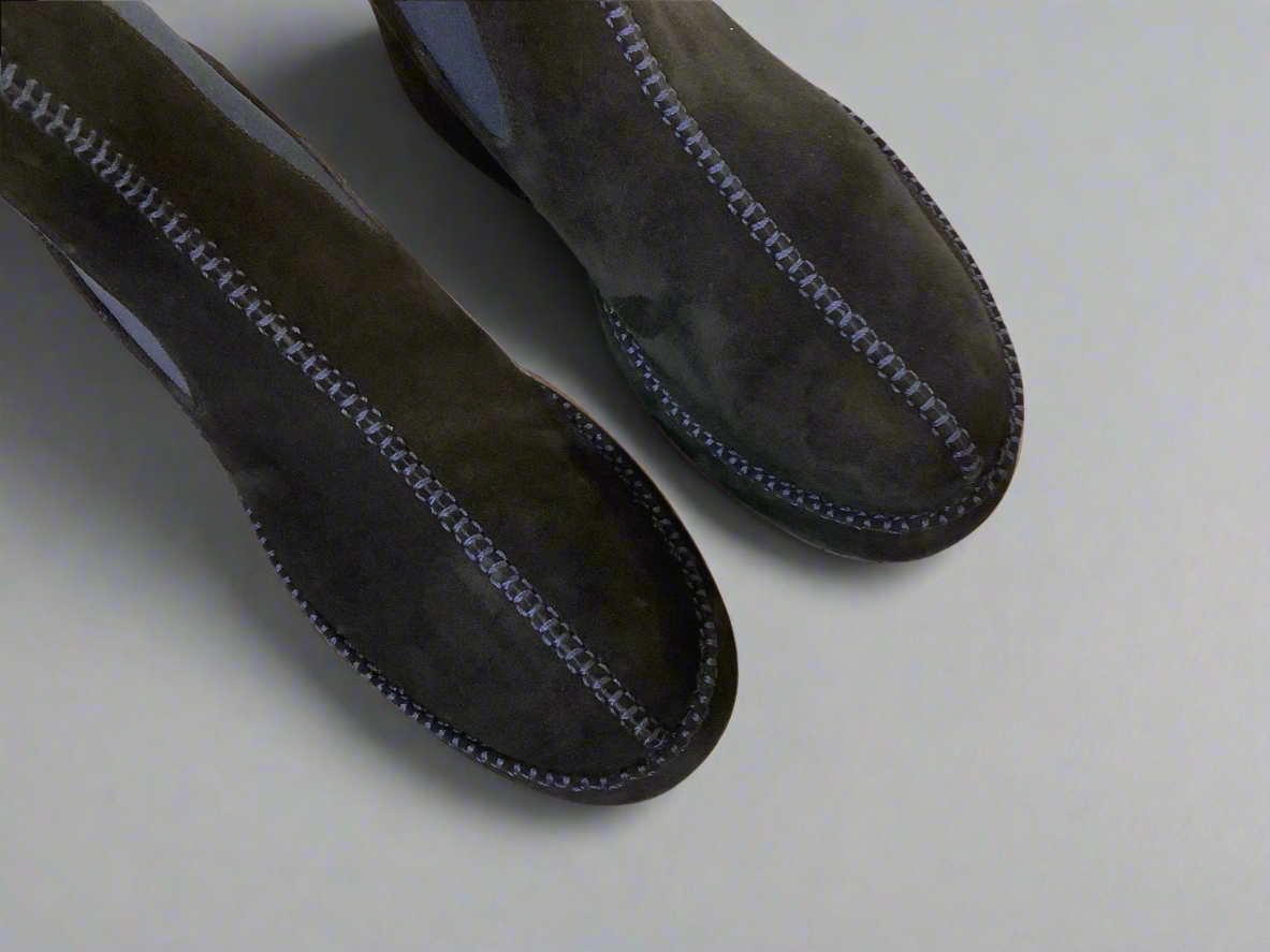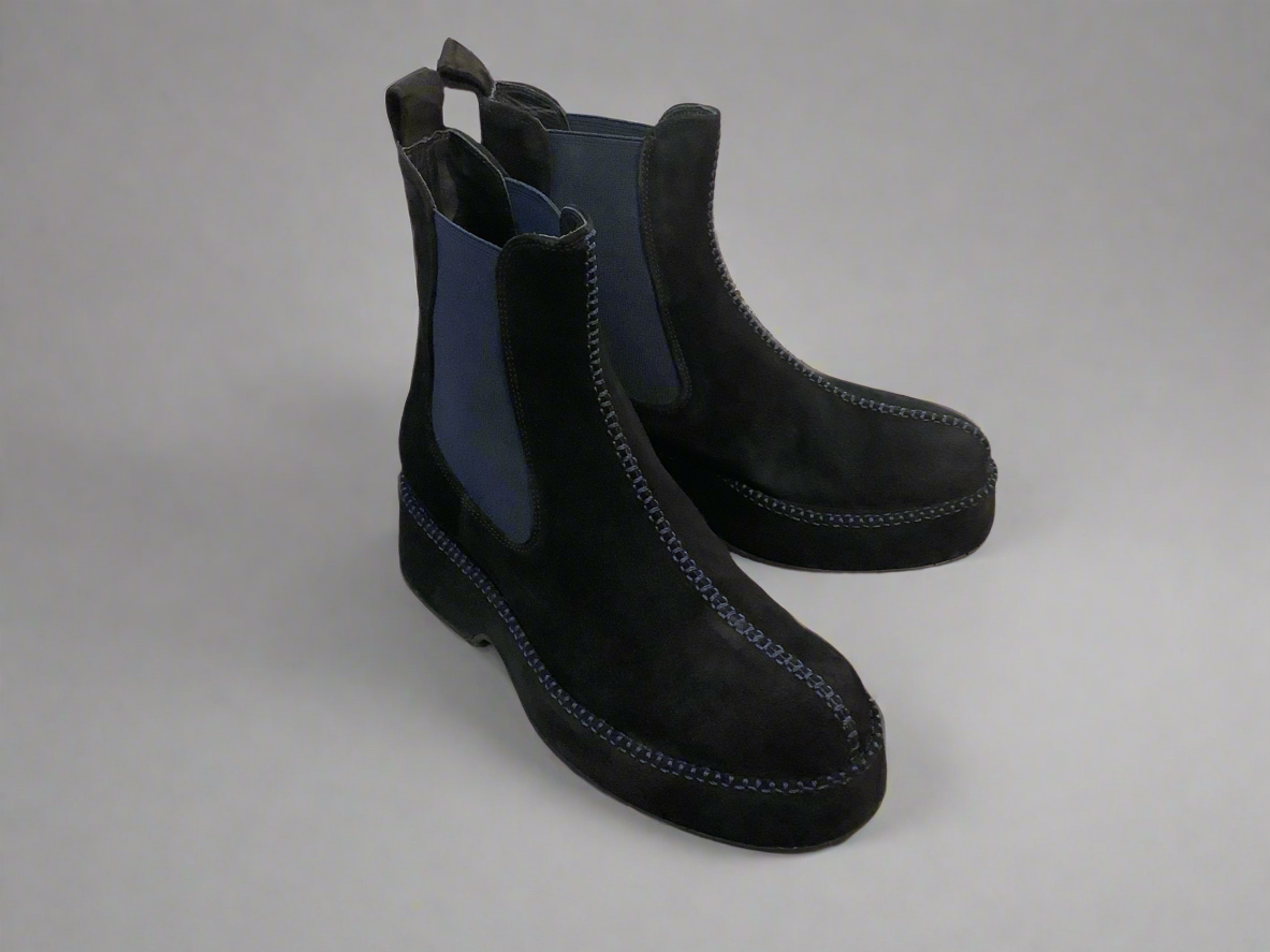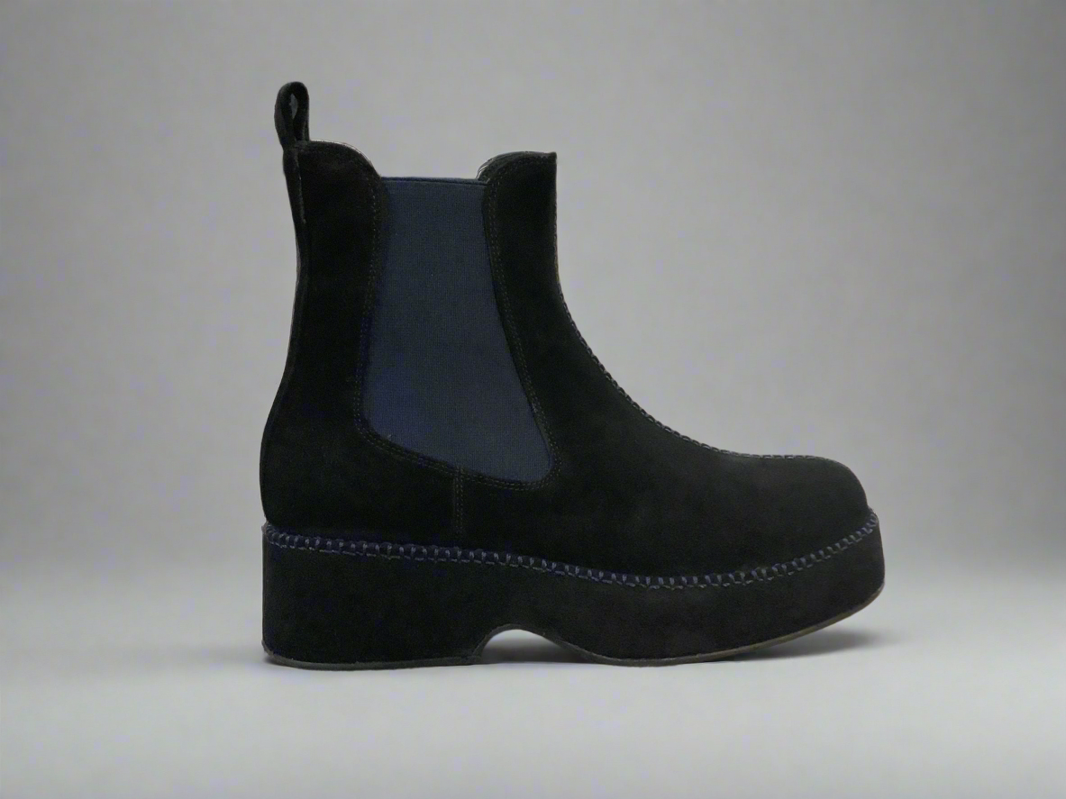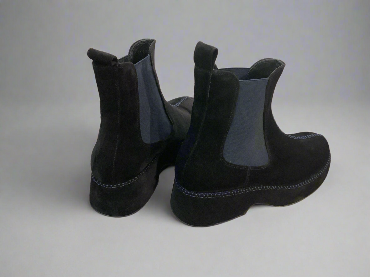 The Pons Quintana 'Flipper' Ankle Boot features a sleek black suede design with a unique navy stitching and gusset detail. The platform adds an extra touch of comfort and style, making these boots the perfect addition to any outfit. Elevate your wardrobe with these expertly crafted boots.