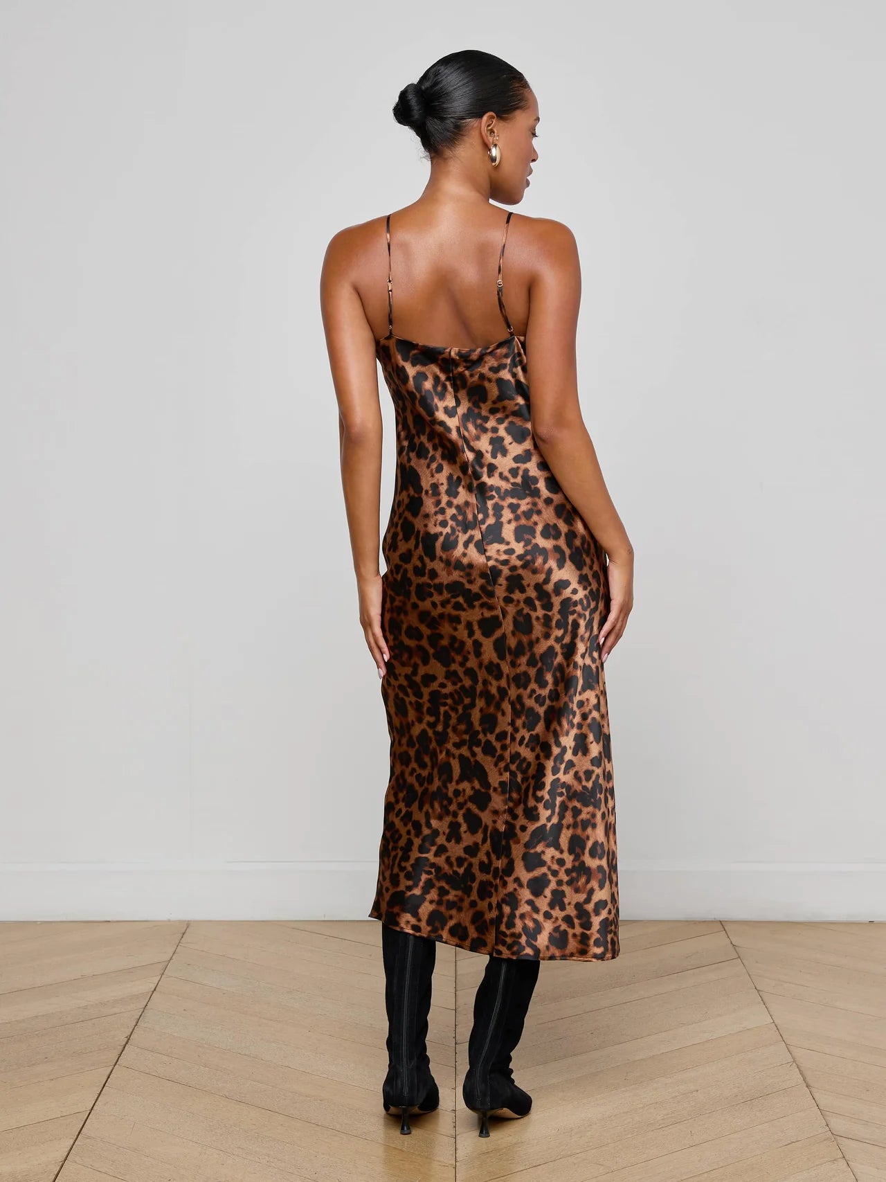 Our iconic silk slip dress is back in a bold leopard print. Designed with a deep V-neck and subtly sexy bias cut, this midi dress is a year-round essential. Pair with a strappy sandal for the perfect special occasion look.