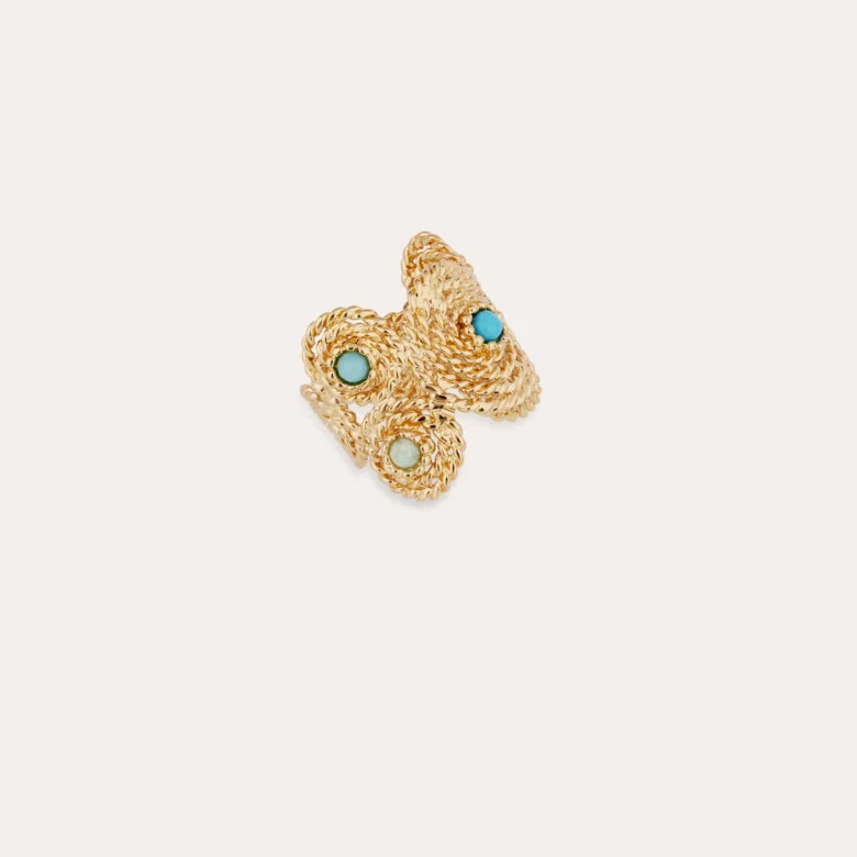Gold-plated ring composed of pieces made of twisted threads. It is adorned with Turquoise & Amazonite gemstones cabochons. Adjustable size.
