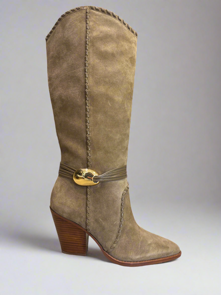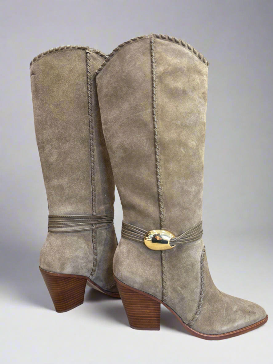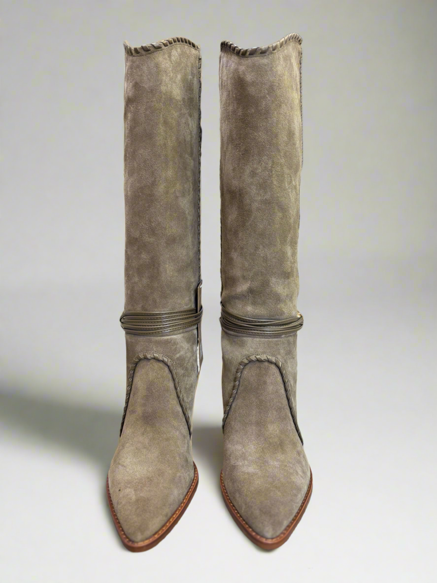 Neutral suede lnee length boot with a western silhouette. Topstitch detail and lacing ankle detail.