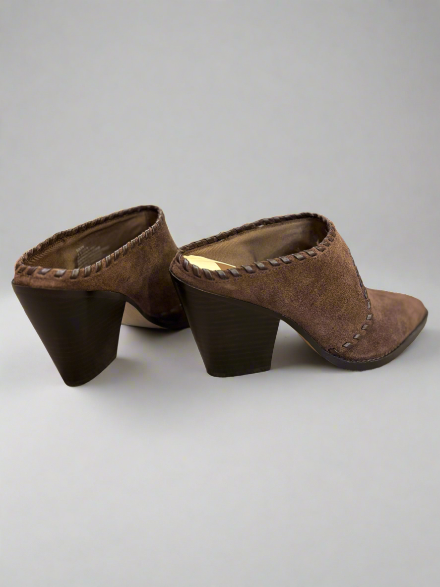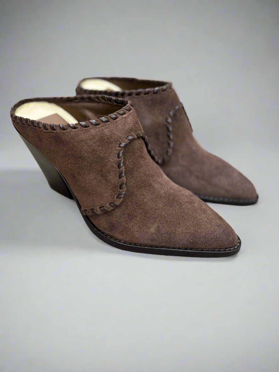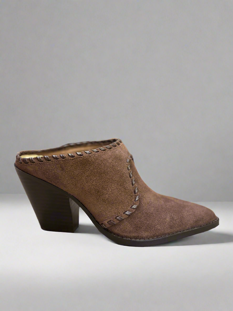 Dolce Vita 'Jolyn' brown suede mule with western detailing. Stacked heel.