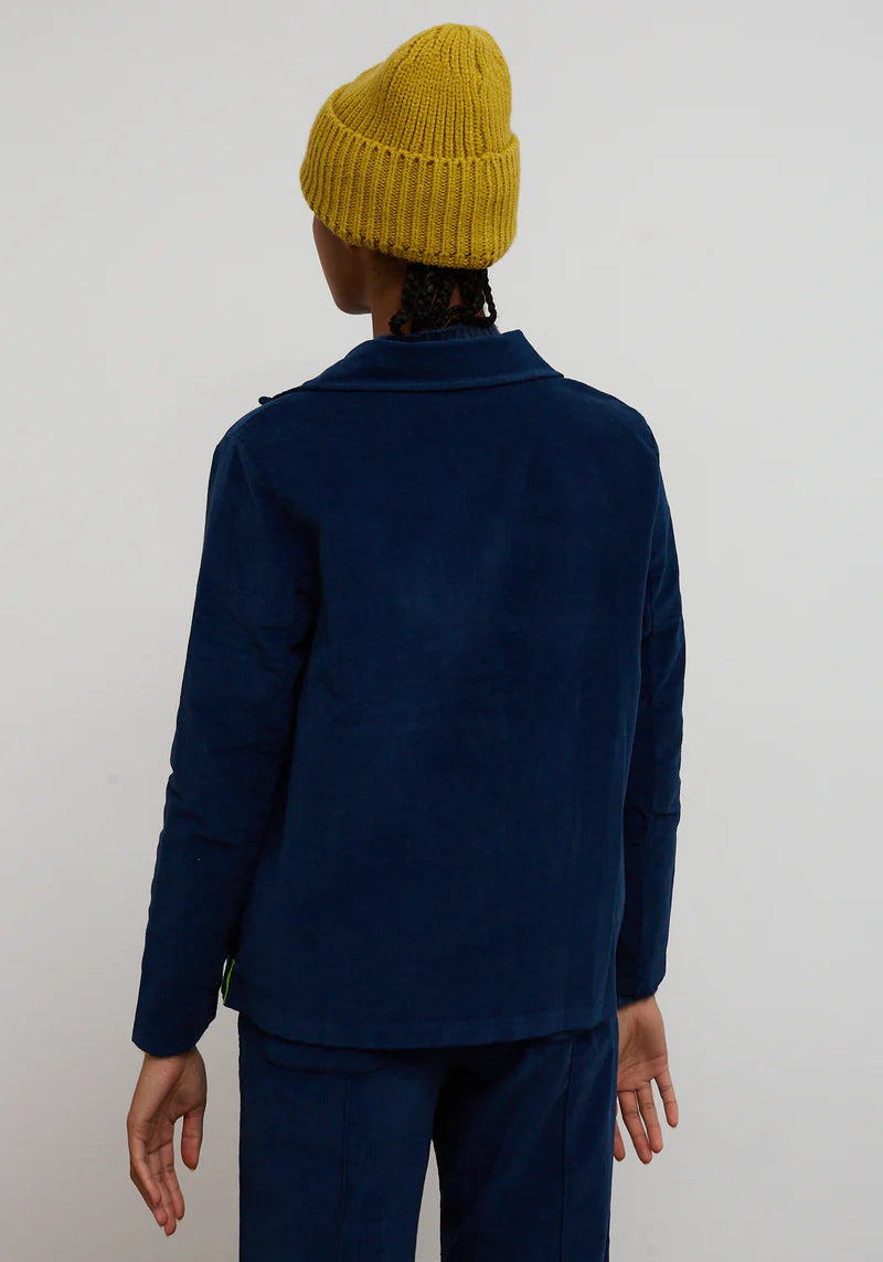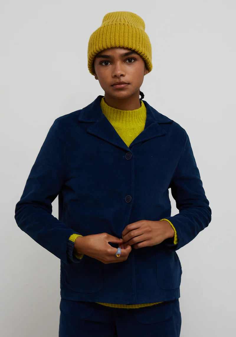 Blue velvet fabric blazer jacket. Straight cut and long sleeves. Collar with classic lapel. Button closure at the front. Square front pockets. Neon color label detail on the side.\
