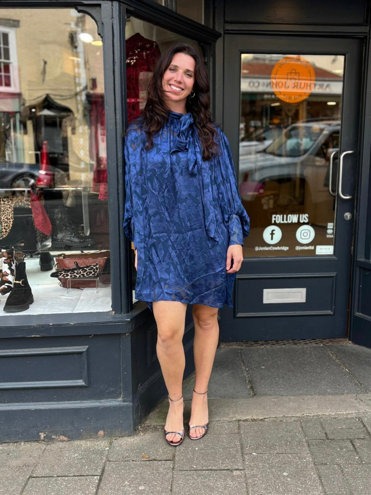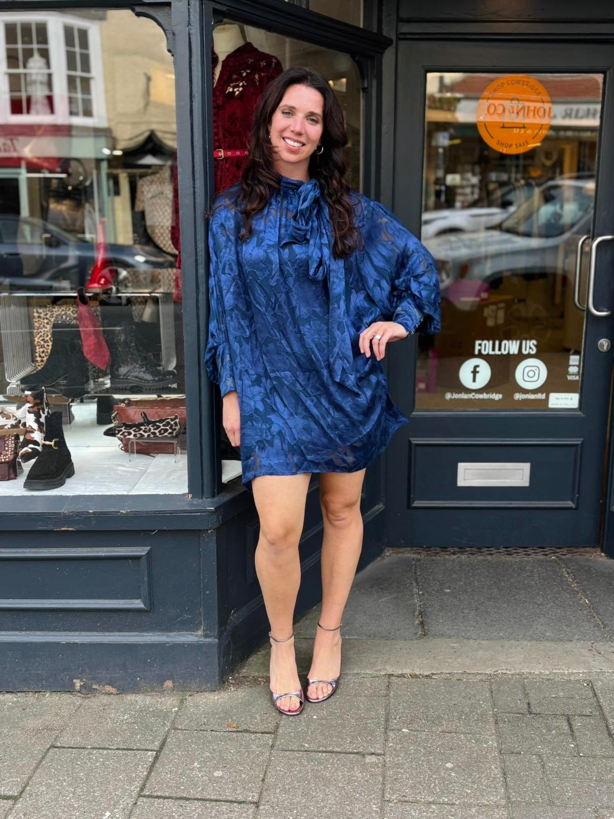 This navy sheer dress is adorned with delicate flower detailing and features a tie neck for added elegance. Includes a complementary under slip for versatile styling options. Designed for a sophisticated and polished look.