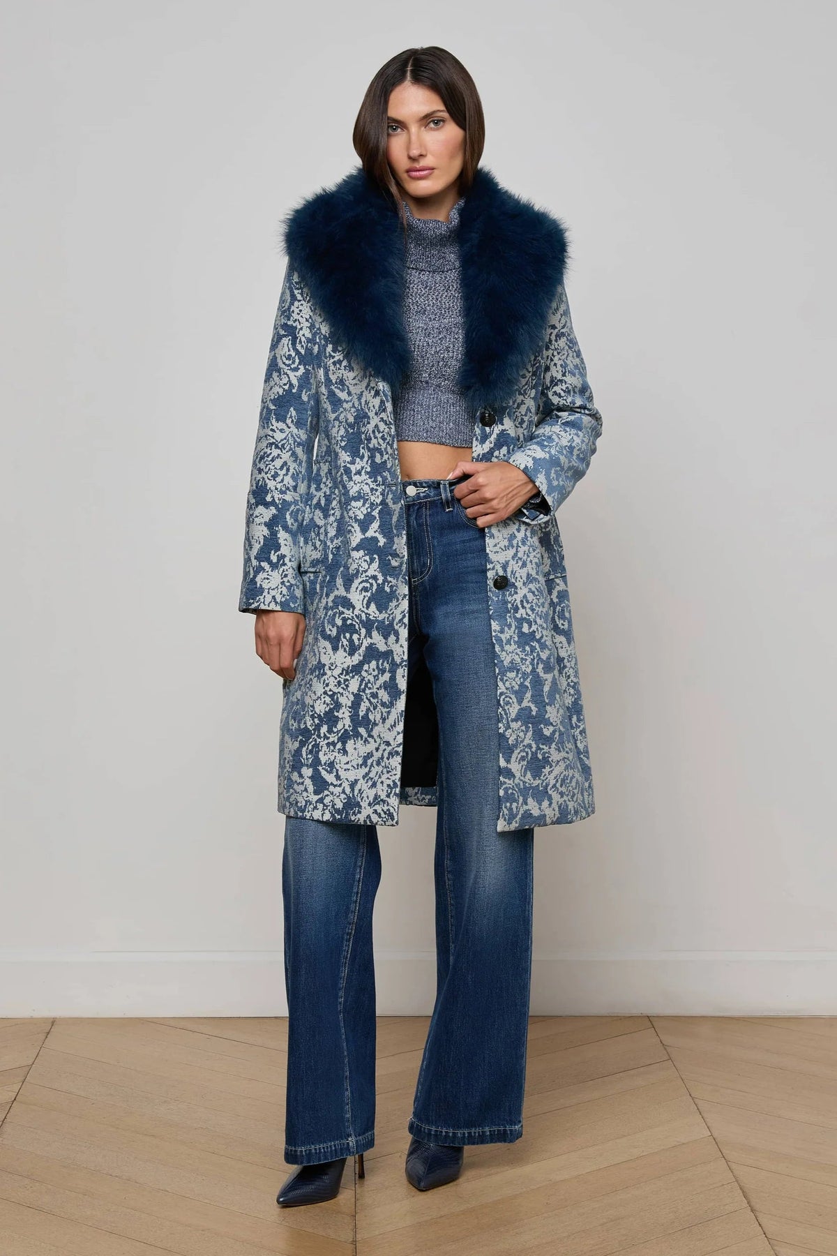 This style debuted at our Fall ‘25 NYFW presentation. With an intricate jacquard pattern and plush faux fur collar, the Laney delivers a style-defining moment with vintage-inspired charm. The rich texture evokes a sense of nostalgia, while modern tailoring keeps it in-the-now. A memorable piece designed to turn outerwear into the main event.