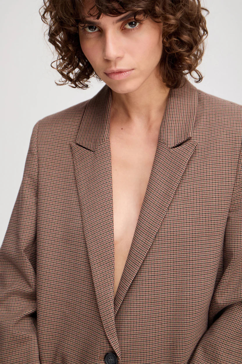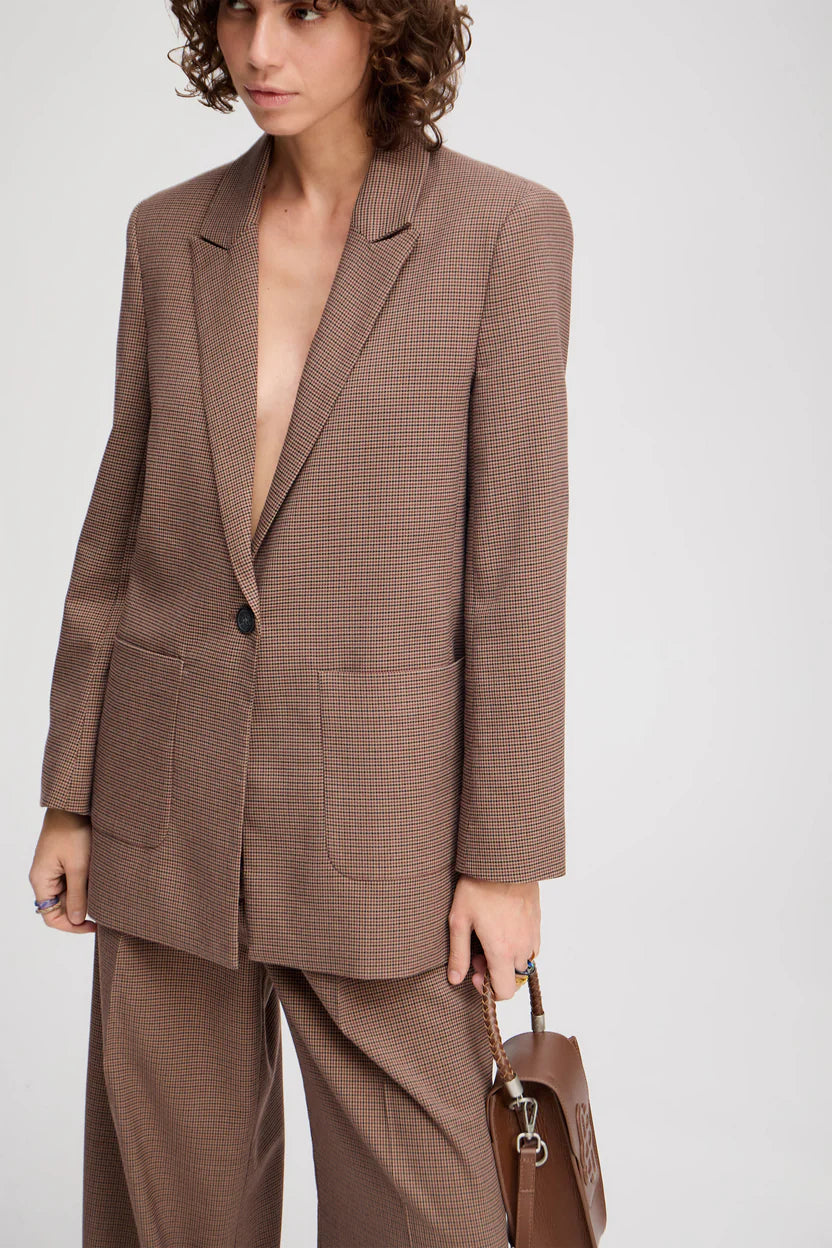 Blazer jacket with beautiful small checks and elegant pockets. This blazer features straight shoulders, long sleeves with buttons, and is designed with a regular fit. The blazer can be closed with a single button.