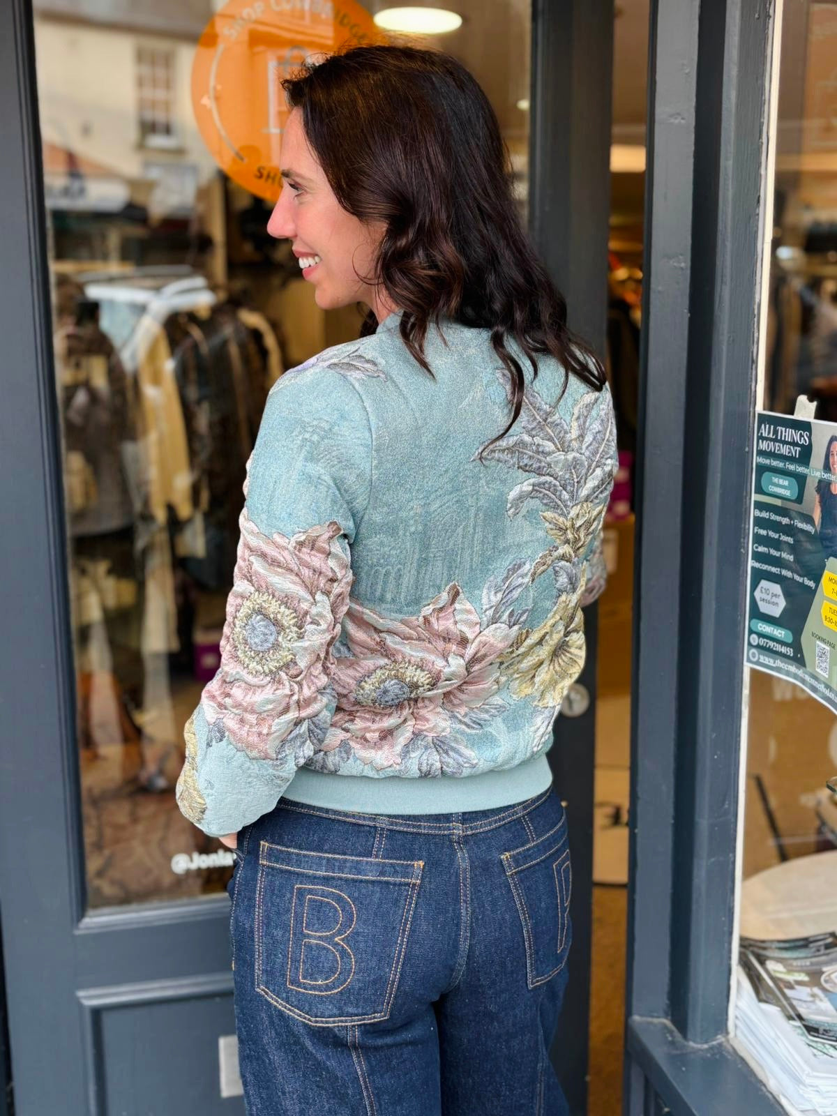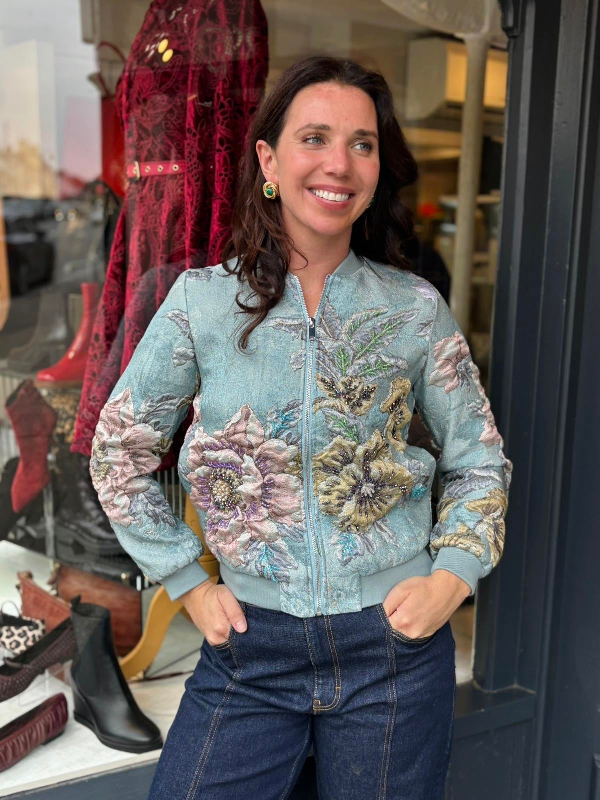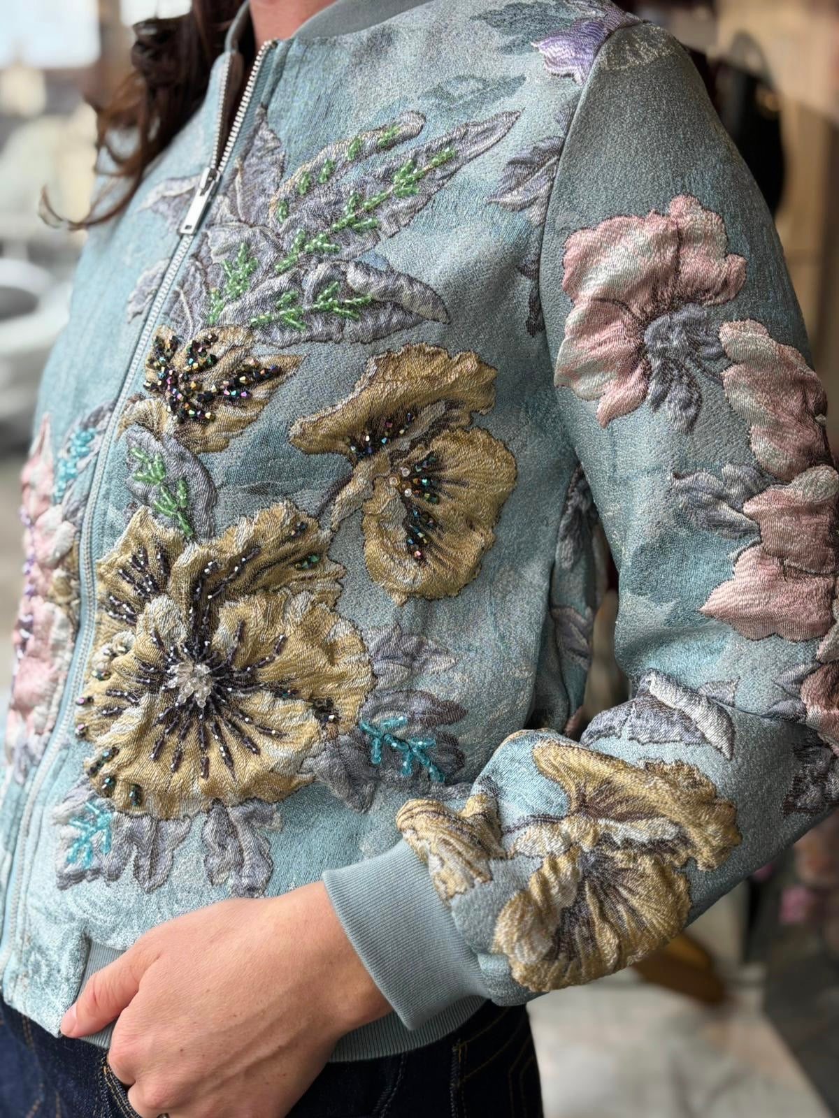 Wrap yourself in luxury with the Dream Catcher 'Adriana' Jacket. Crafted from a soft ice blue fabric and adorned with delicate appliqué and shimmering beads, this jacket is the epitome of elegance. Perfect for adding a touch of glamour to any outfit, the 'Adriana' Jacket is a must-have for any fashion-forward individual.