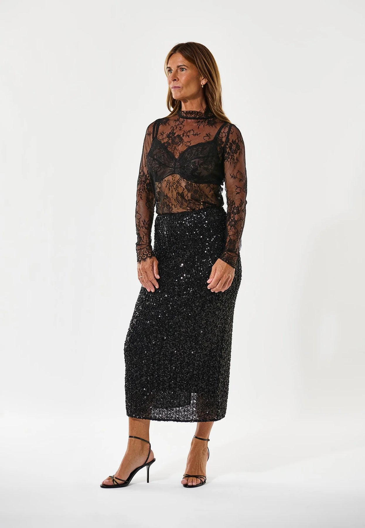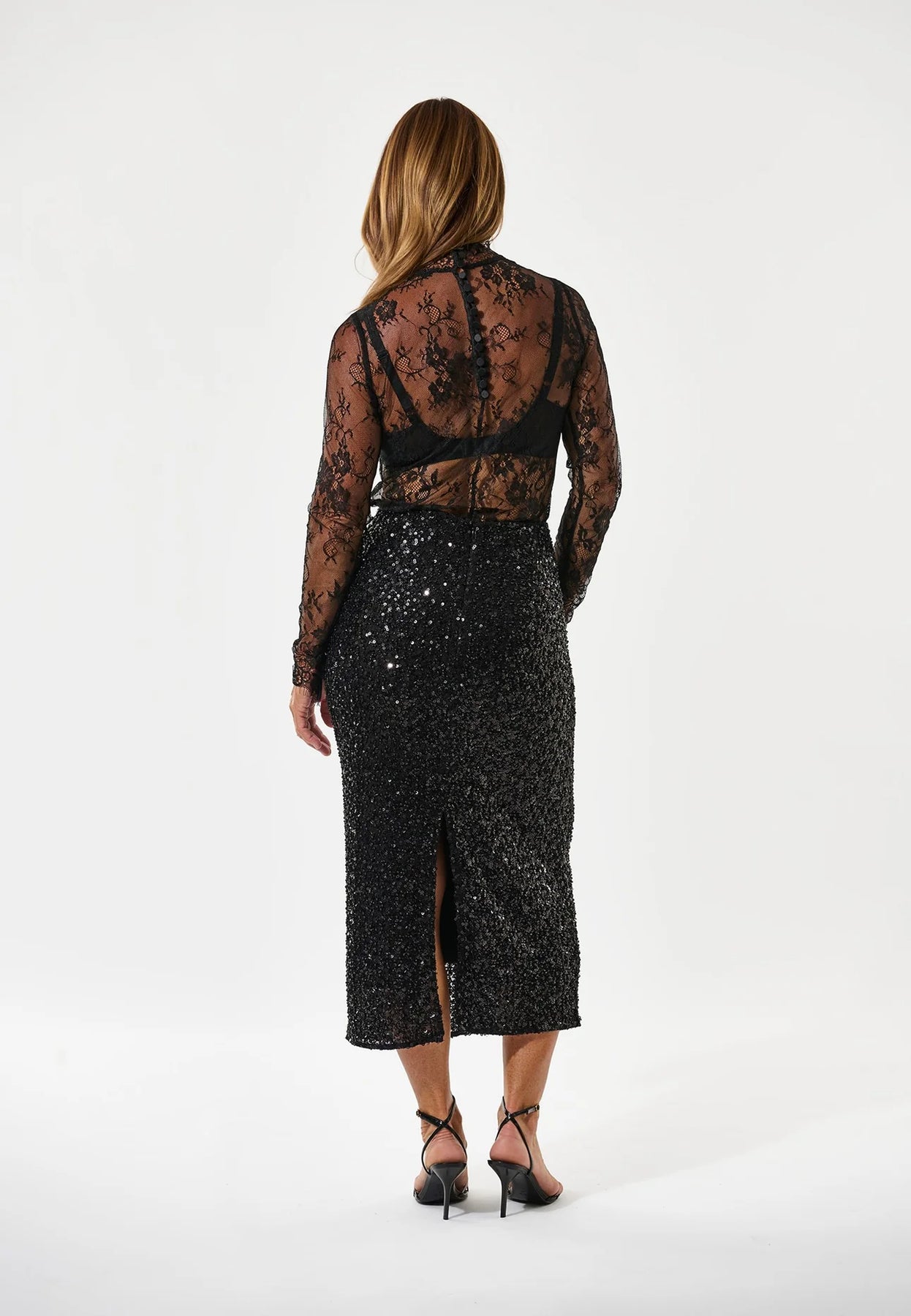Perfect for a party or special event, this high necked long sleeved top in black lace is a sophisticated and modern take on evening wear. Fitted close to the body, it has scalloped edges at neck, cuffs and hem and looks beautiful worn over a bra or camisole top or layered under a simple black blazer. It fastens with covered buttons at the back neck.