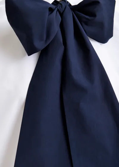 100% cotton shirt is designed for an oversized fit and features dropped shoulders for a relaxed silhouette. The removable oversized bow tie in a contrasting color adds a bold statement, while the rounded hemline — longer at the back — gives a structured finish. Finished with a classic button fastening, this versatile piece can be styled with or without the bow for two distinct looks.