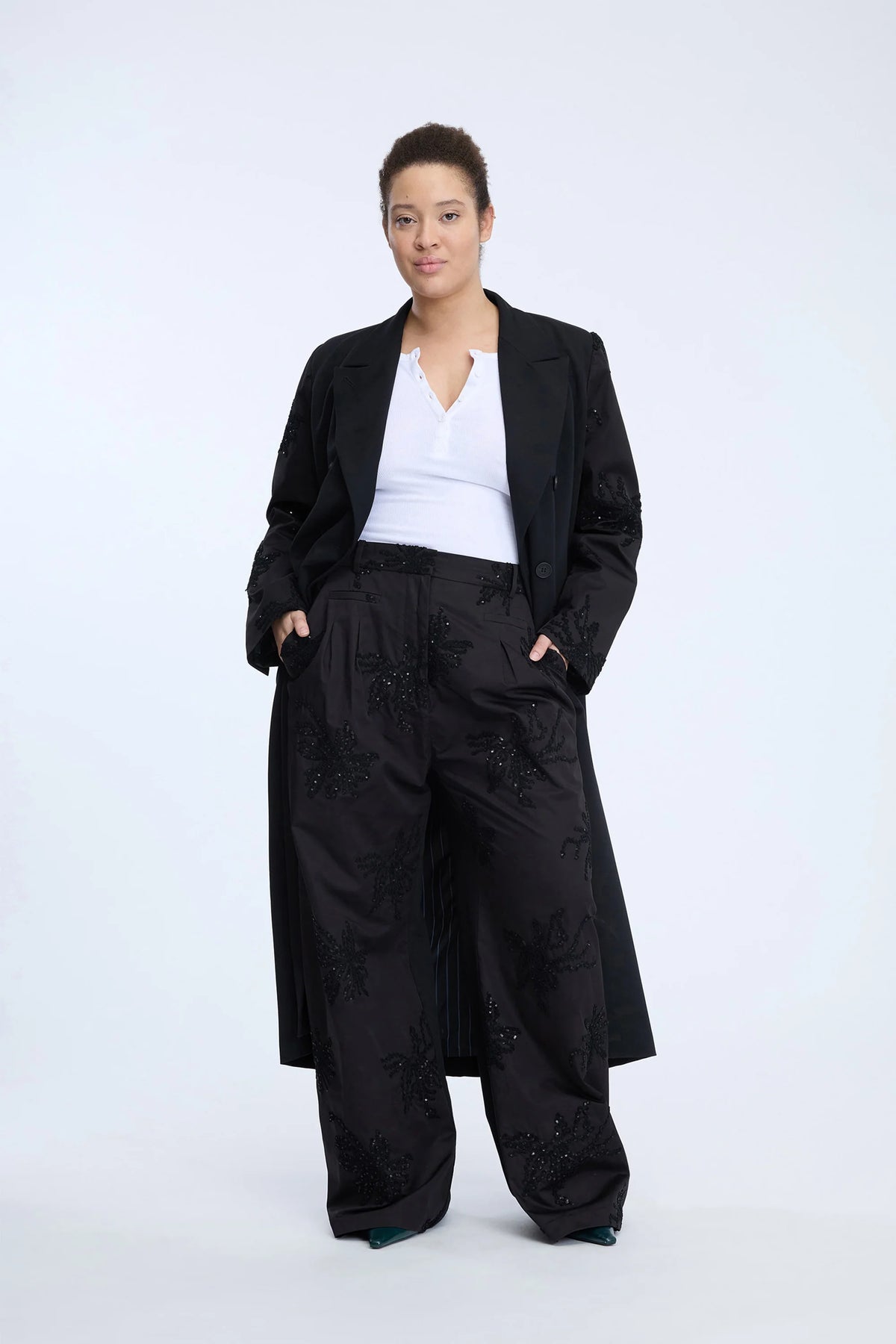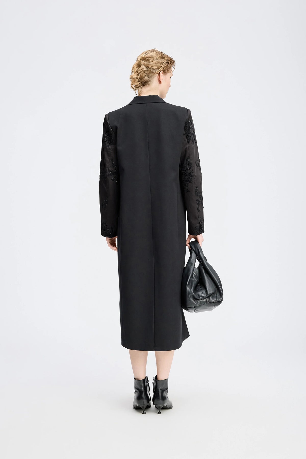 Long black blazer coat with a double-breasted closure and elegant embroidered sleeves adorned with tone-on-tone sequins and beads. Designed with a classic lapel, flap pockets, and a straight, sophisticated silhouette.