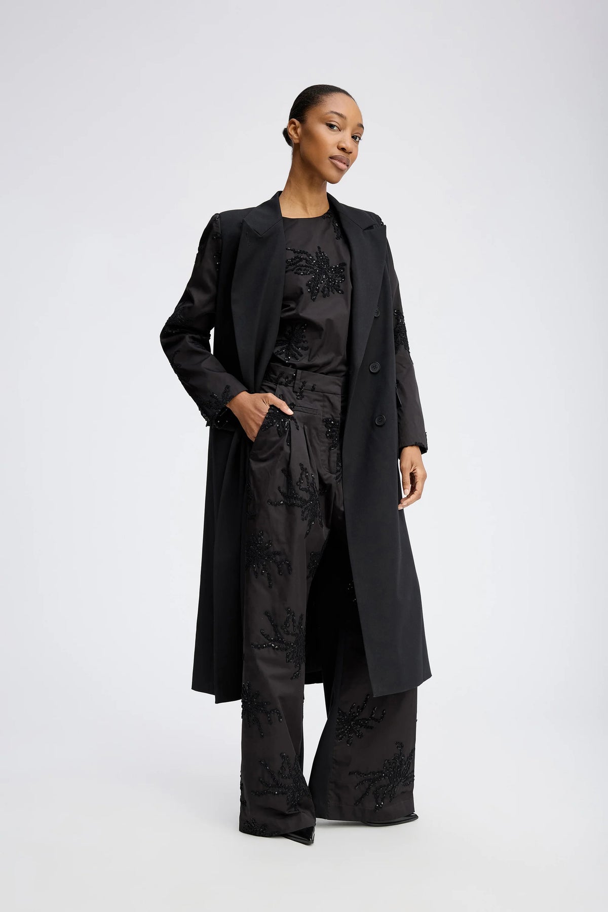 Elegant wide-leg trousers with beautiful tone-on-tone sequin and bead embroidery. Designed with a high waist, pressed creases, belt loops, and side pockets.