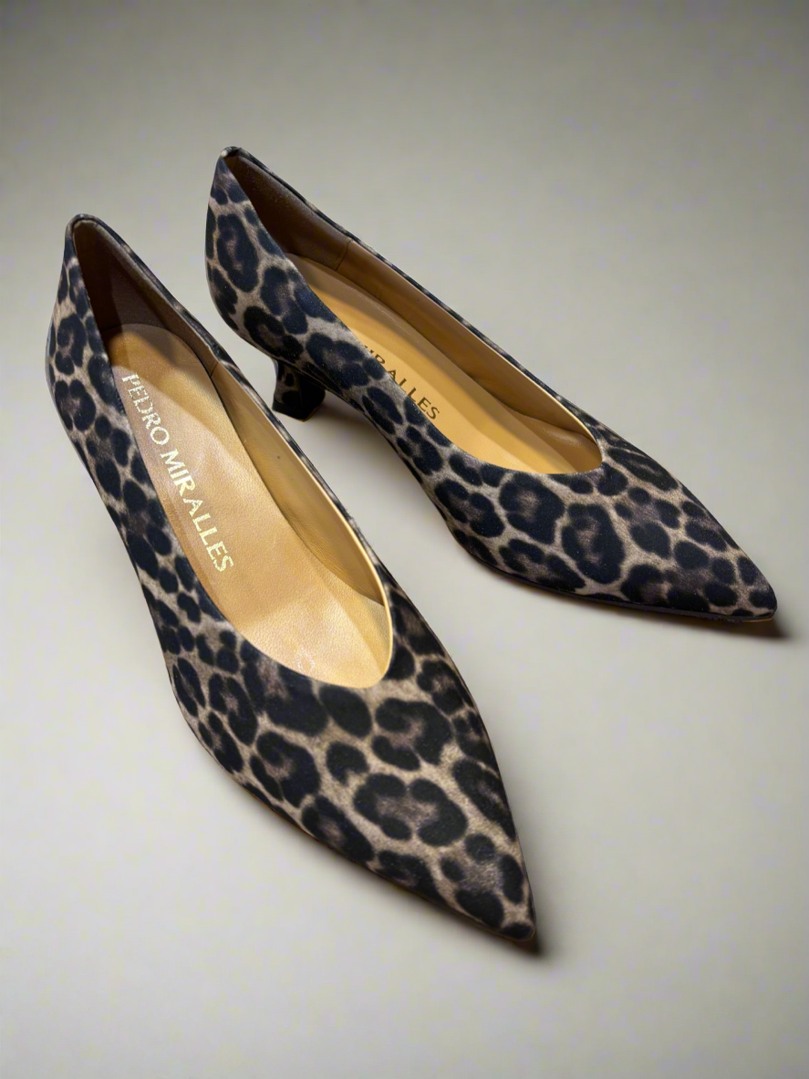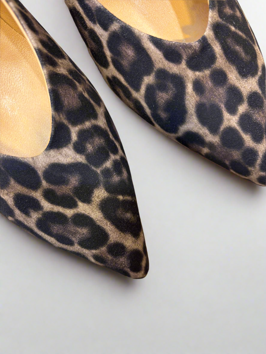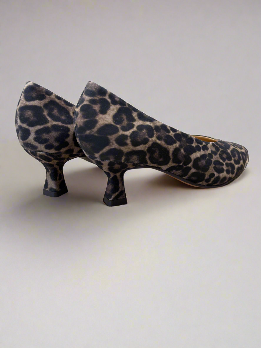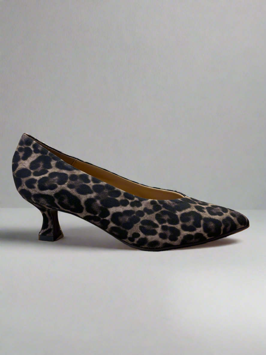 Leopard print court shoe with kitten heel.