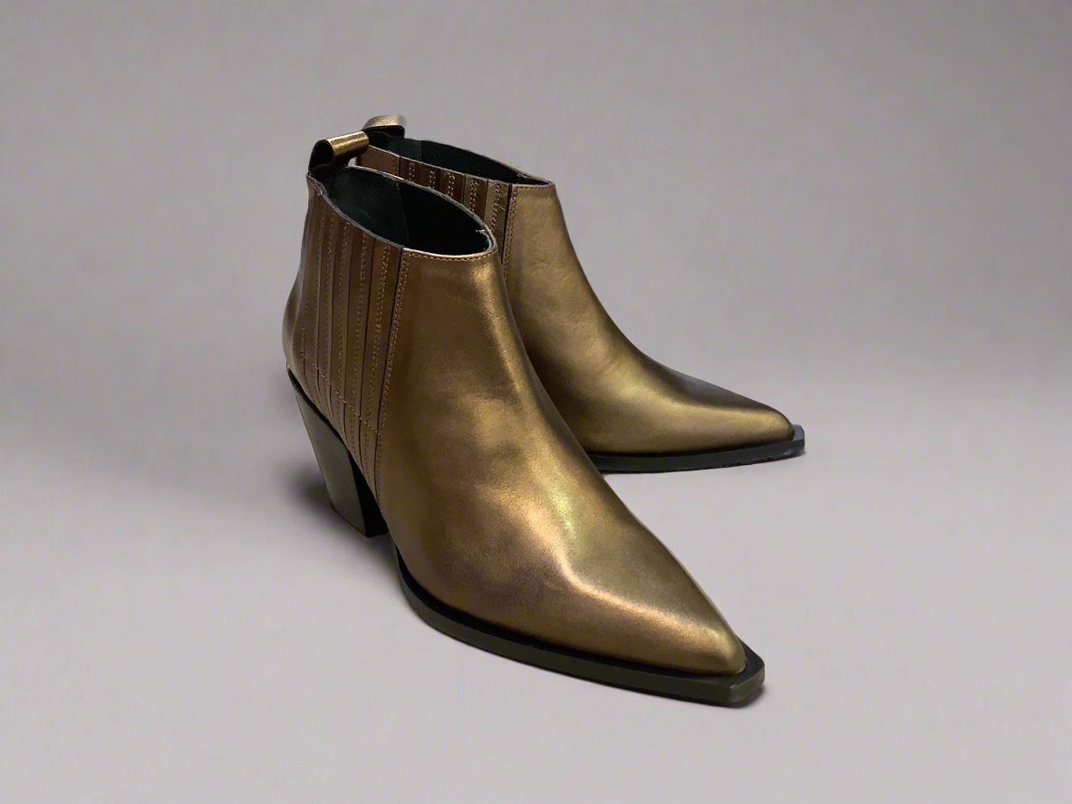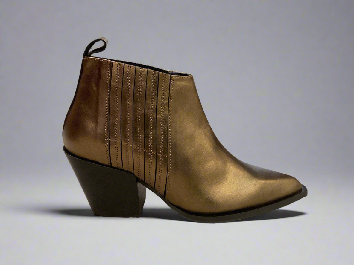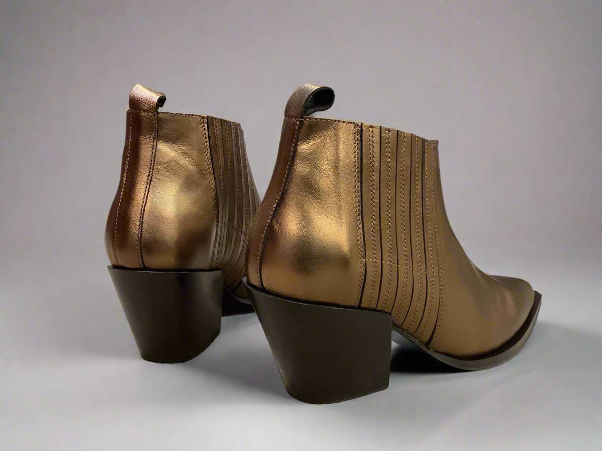Bronze leather ankle boot with western detailing. Pull on tab with elasticated opening.