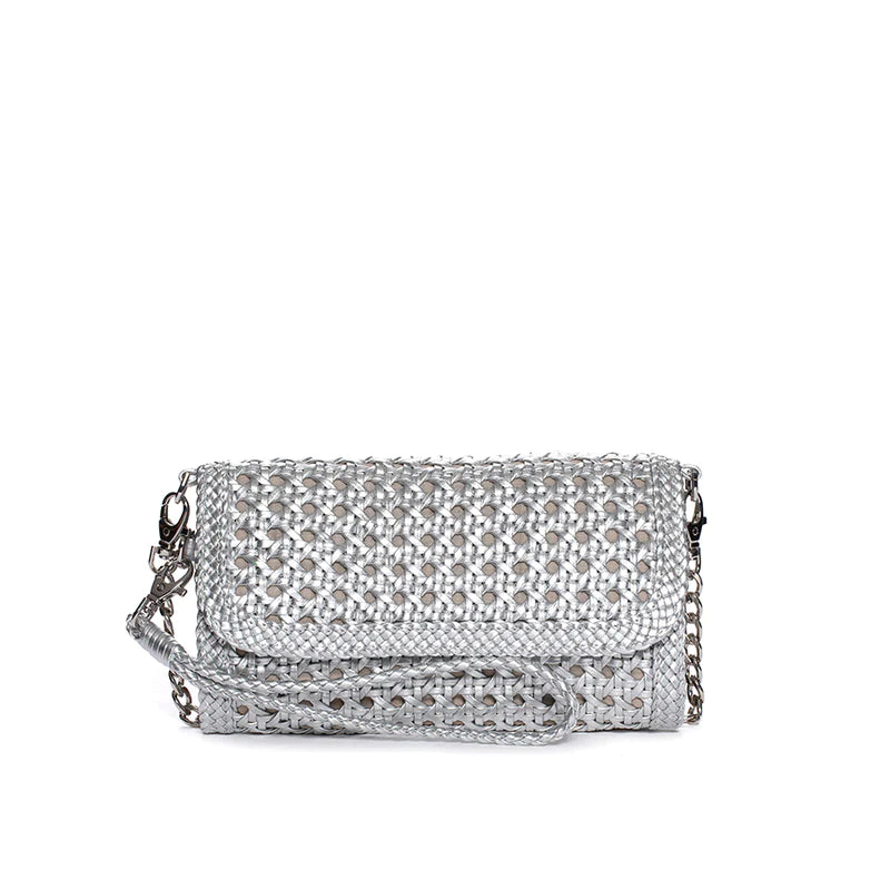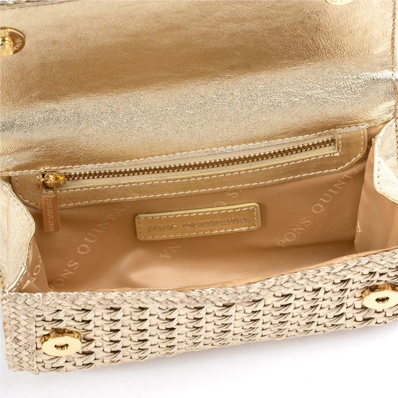 Get ready to add a touch of elegance and whimsy to your outfit with the Pons Quintana 'Ritz' Clutch! Made of high-quality woven leather, this clutch is perfect for carrying your essentials in style. Its unique design and expert craftsmanship make it a must-have accessory for any fashion-forward individual. Available in silver or gold.