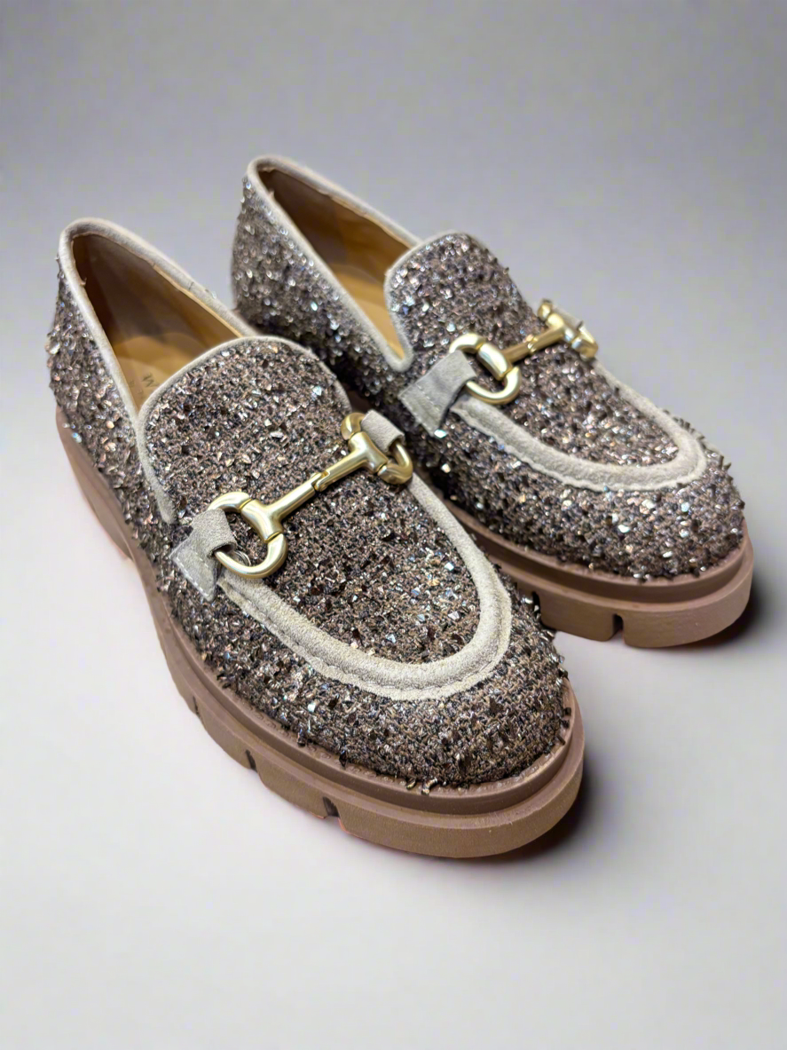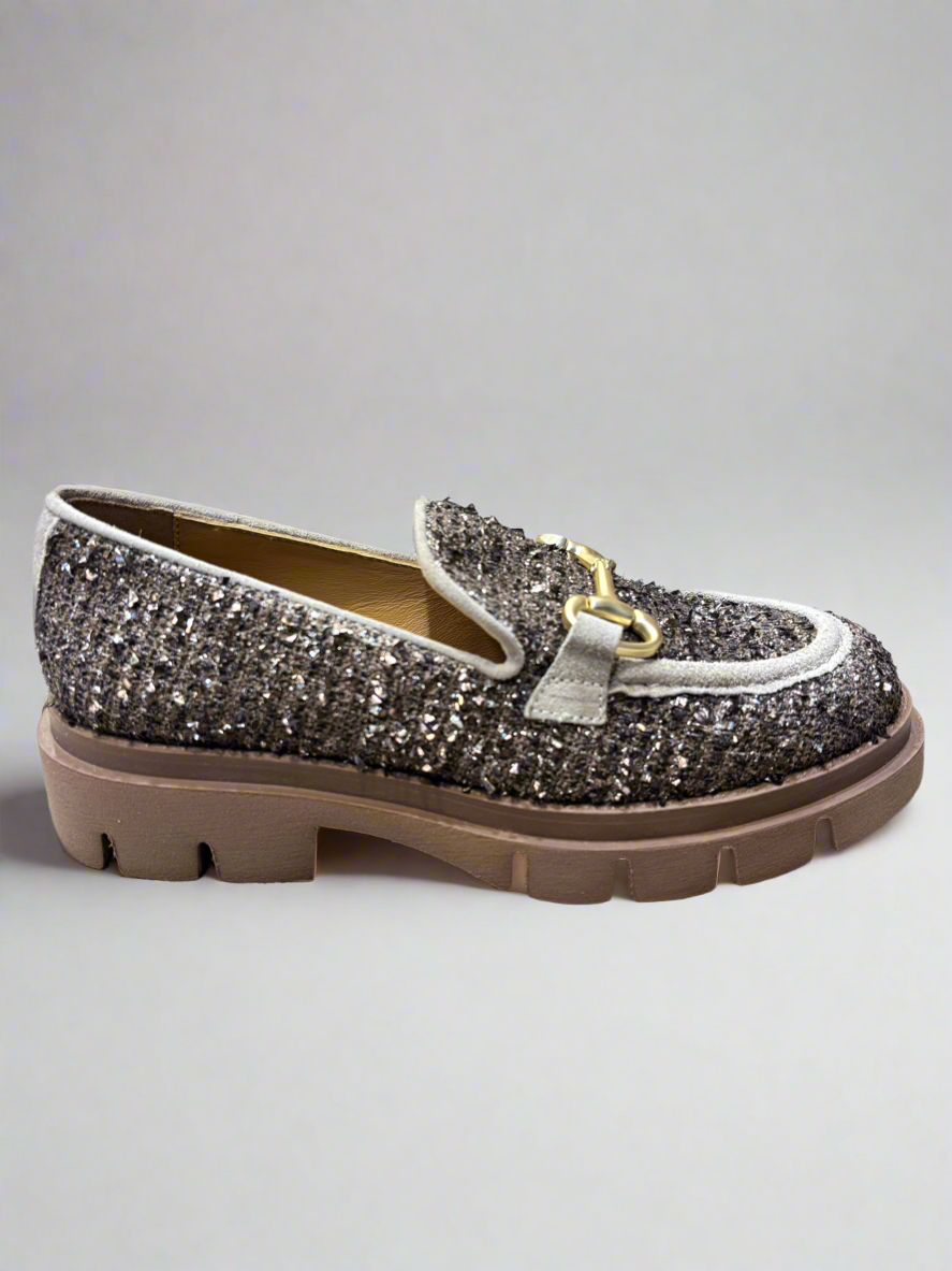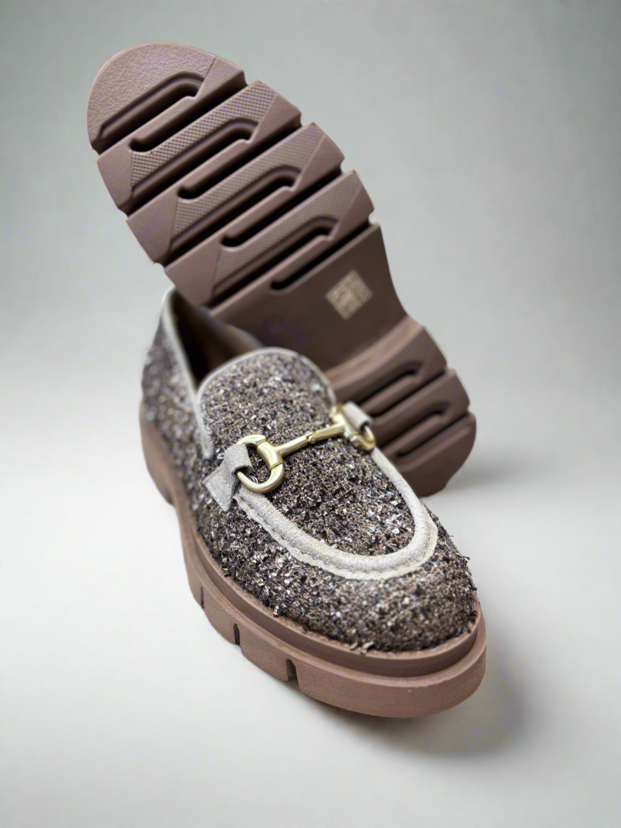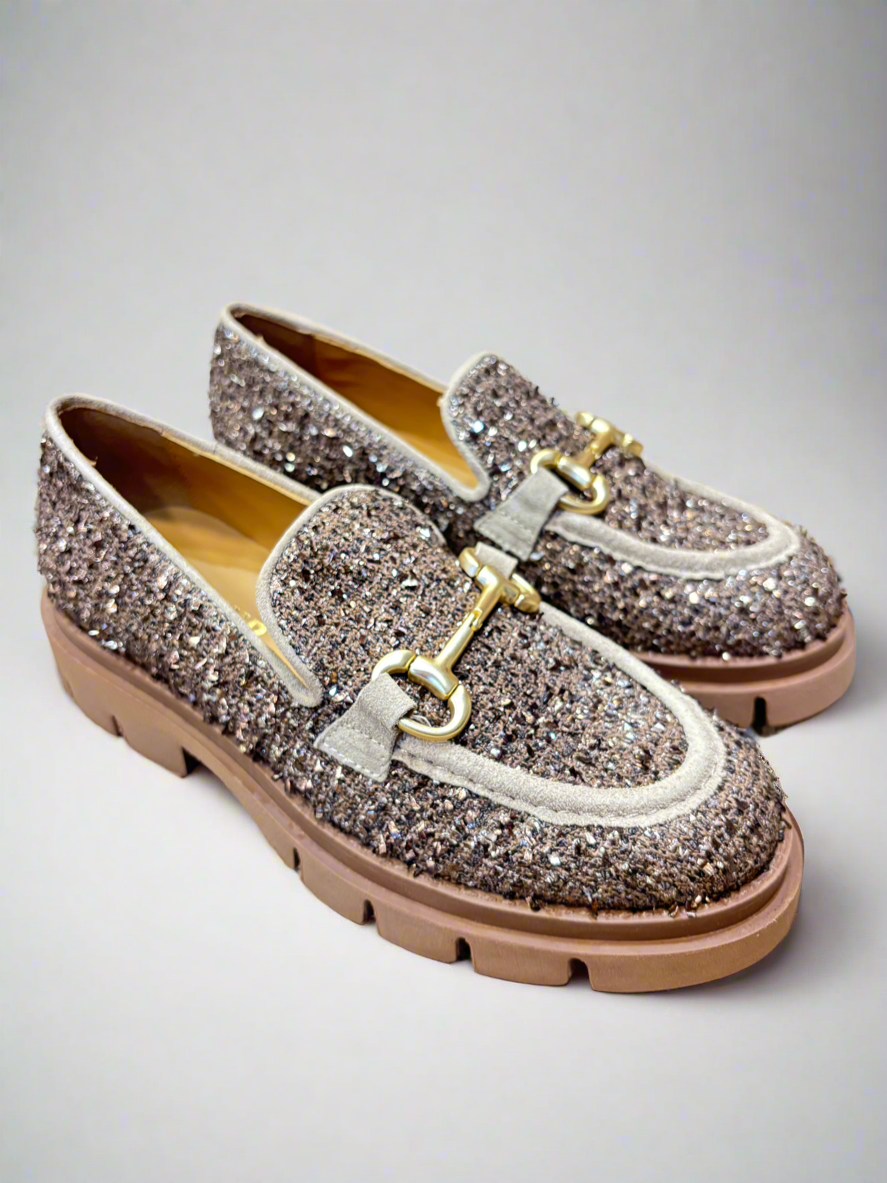 Super light weight loafer in tweed effect neutral colour with metallic thread. Brushed gold hardware with leather lining. Chunky lightweight sole.