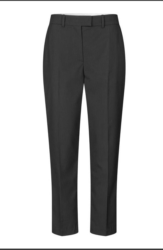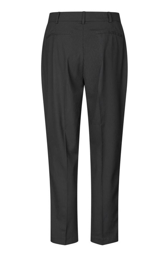 The Dea Kudibal 'Arielladea' trousers feature a sleek black pinstripe pattern crafted in a cigarette style fit. Designed for a tailored silhouette, these trousers offer a refined, contemporary look ideal for professional or smart-casual settings. The subtle pinstripe detail enhances a classic aesthetic while maintaining versatility for various wardrobe combinations.