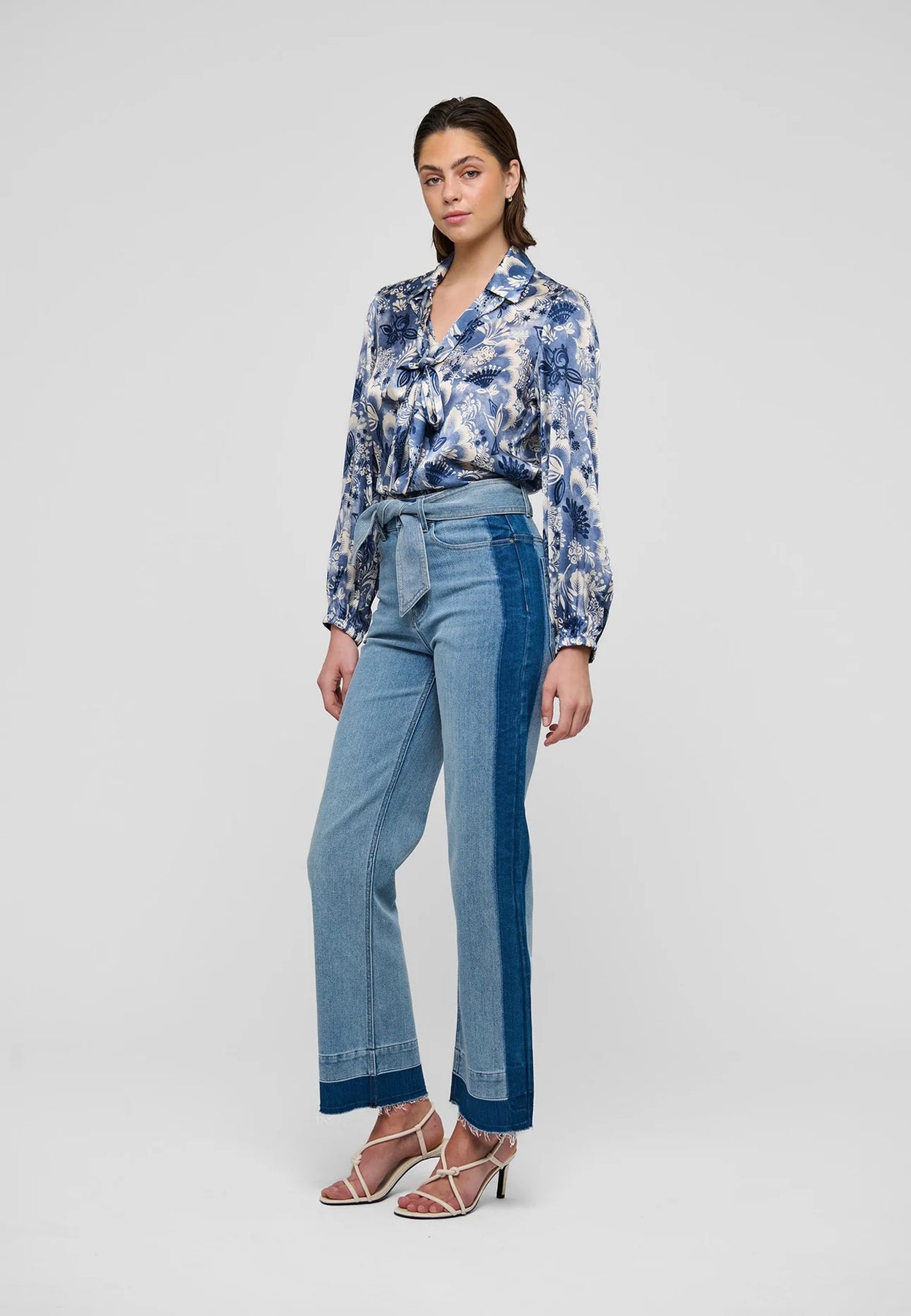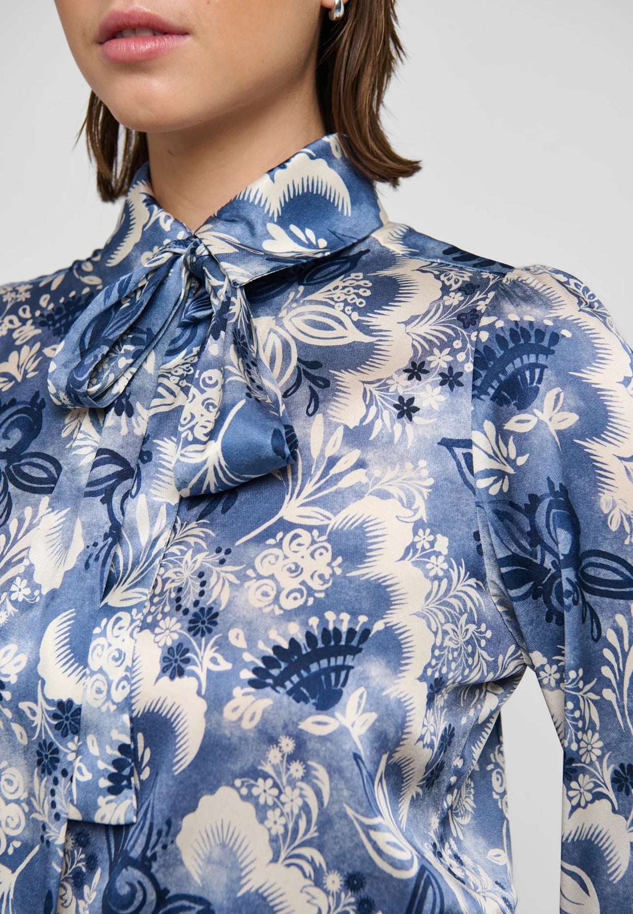 Versatile and chic, a tie neck blouse in silk is a wardrobe essential. This version in a beautiful print of exotic flowers in shades of blue has a regular fit with full sleeves and narrow cuffs. Tie the neck scarf in an extravagant bow or let it hang loose for a more relaxed attitude.