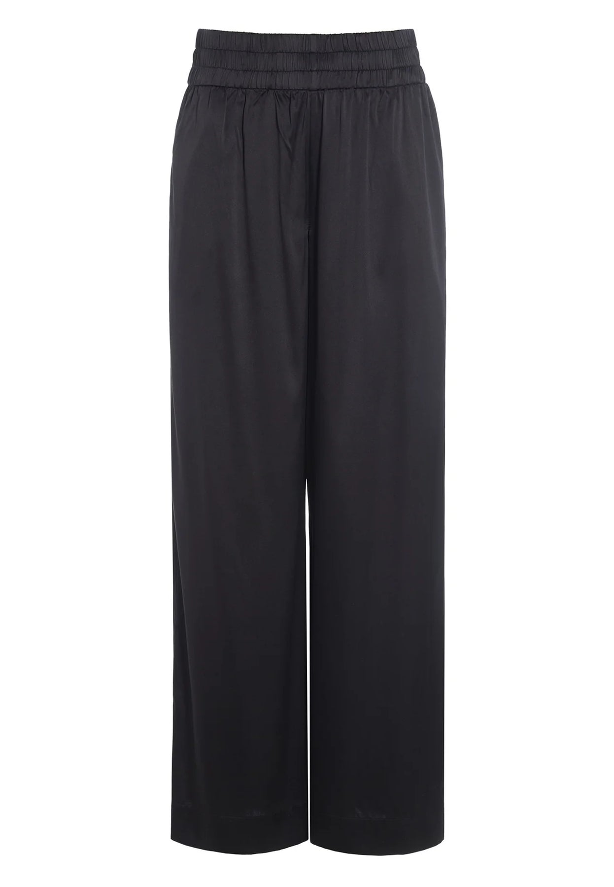 Wide leg pants in silk are a DEA KUDIBAL classic and this pair in jet black with a wide elastic waistband are a great example. Wear with a simple top or a knit for an effortlessly stylish outfit.