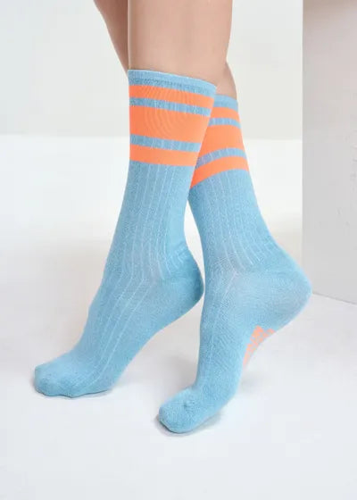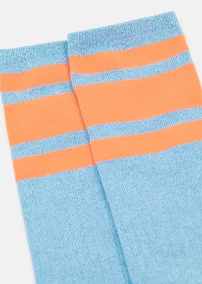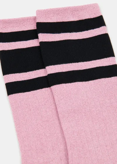 Rib-knitted socks are crafted from a soft cotton blend and feature three stripes along the side. Wear them pulled up over your leggings to show off the design.