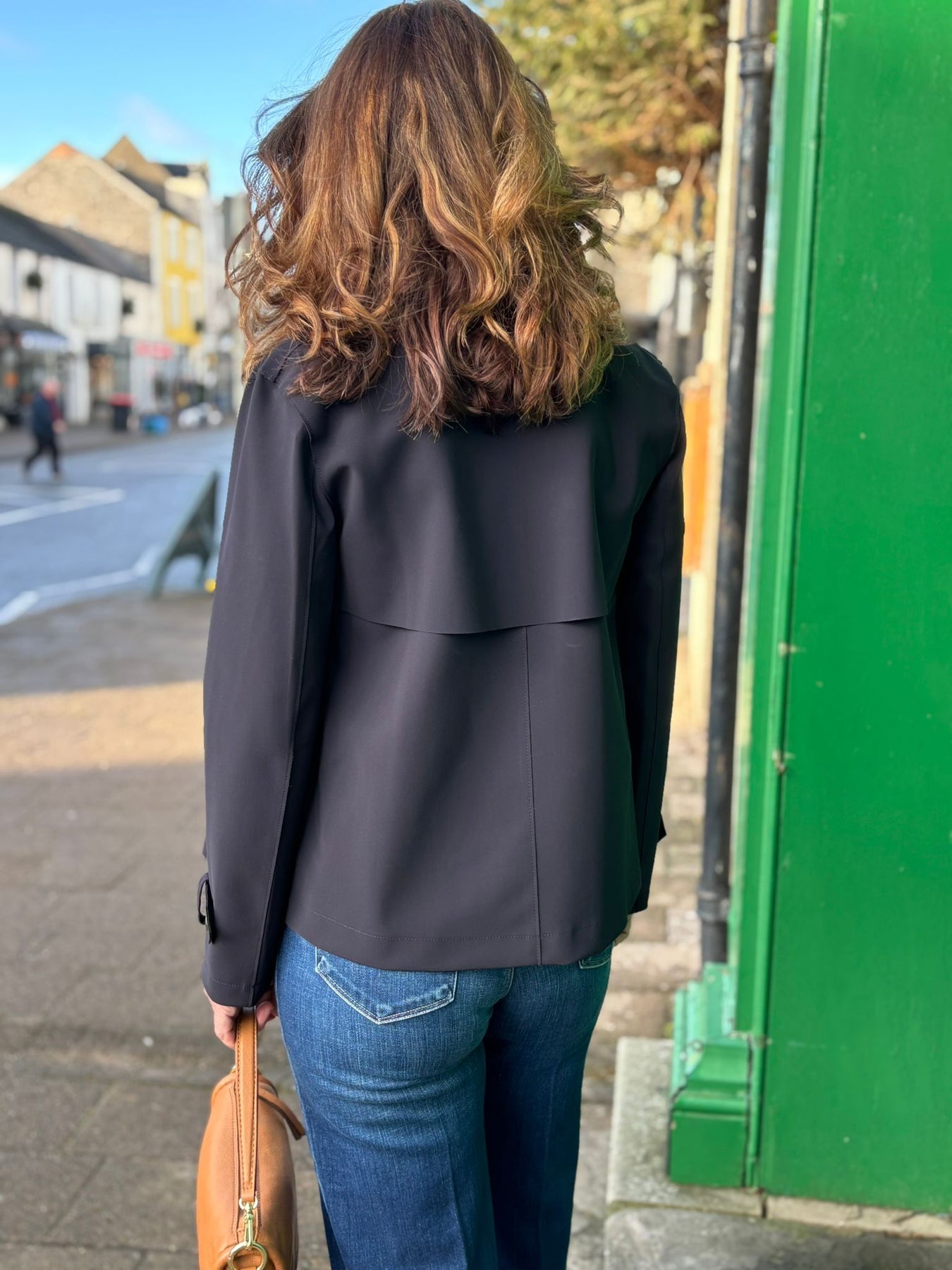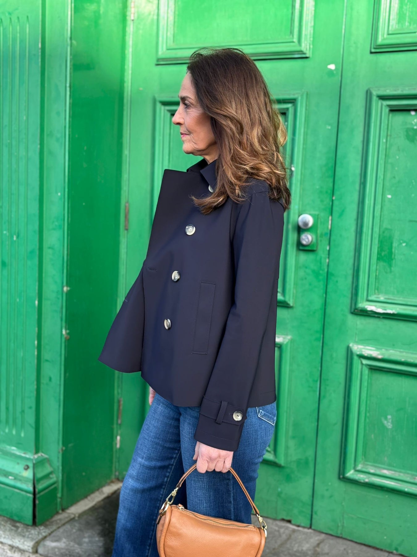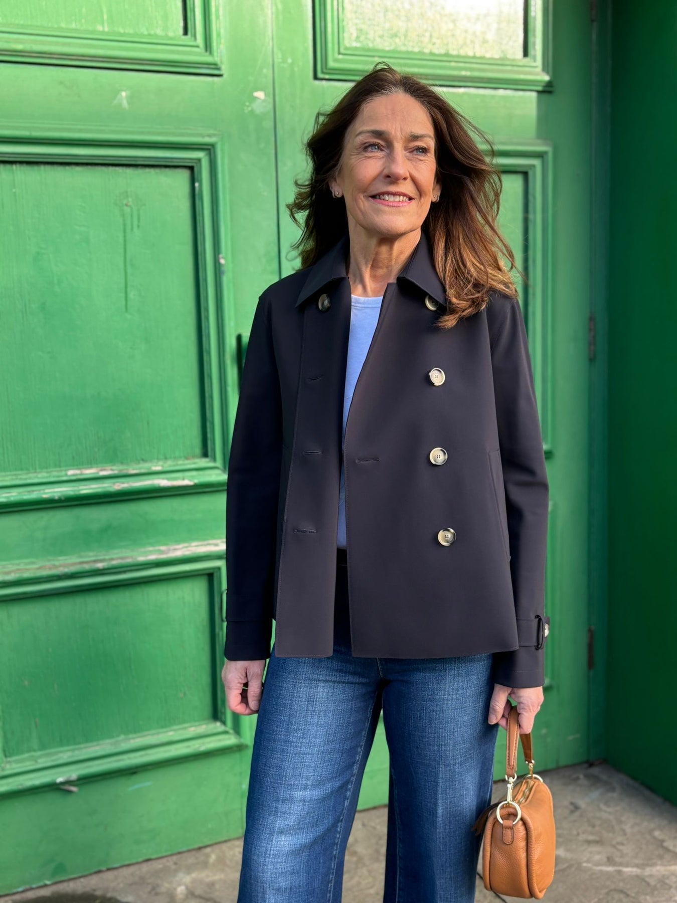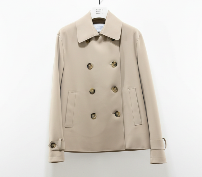 The double-breasted pea coat is crafted from lightweight fabric, offering a balance of warmth and comfort without bulk. The structured collar provides a classic silhouette. Designed for versatility, this jacket is suitable for varied climates, making it an essential addition to any wardrobe.