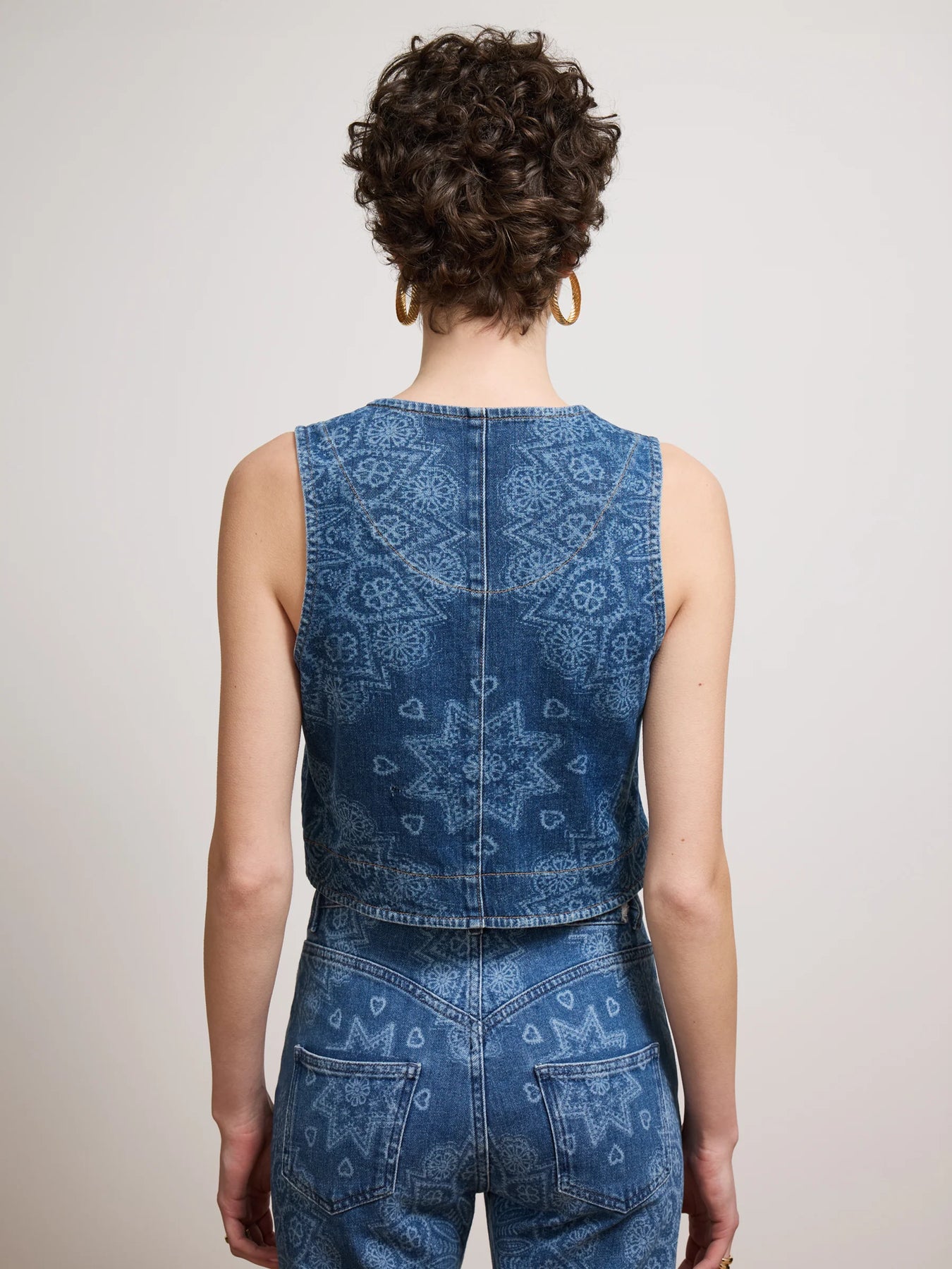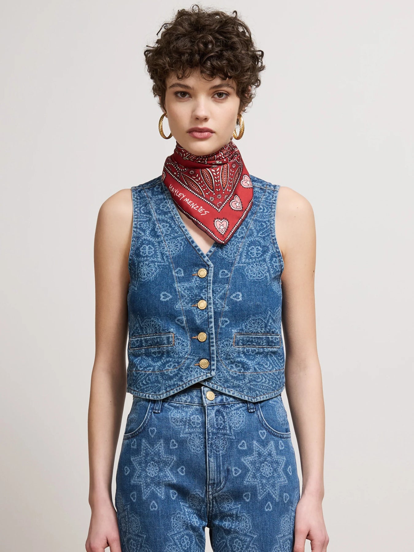 Our Dalton print is nothing short of an obsession - now yours as a fitted denim waistcoat. This blue-jean top features a laser-printed bandana motif that brings a bold twist to a classic tailoring shape. Finished with branded metal buttons and half-lined to the reverse for comfort, it's the piece all the cowgirls are reaching for - especially with the matching flares.
