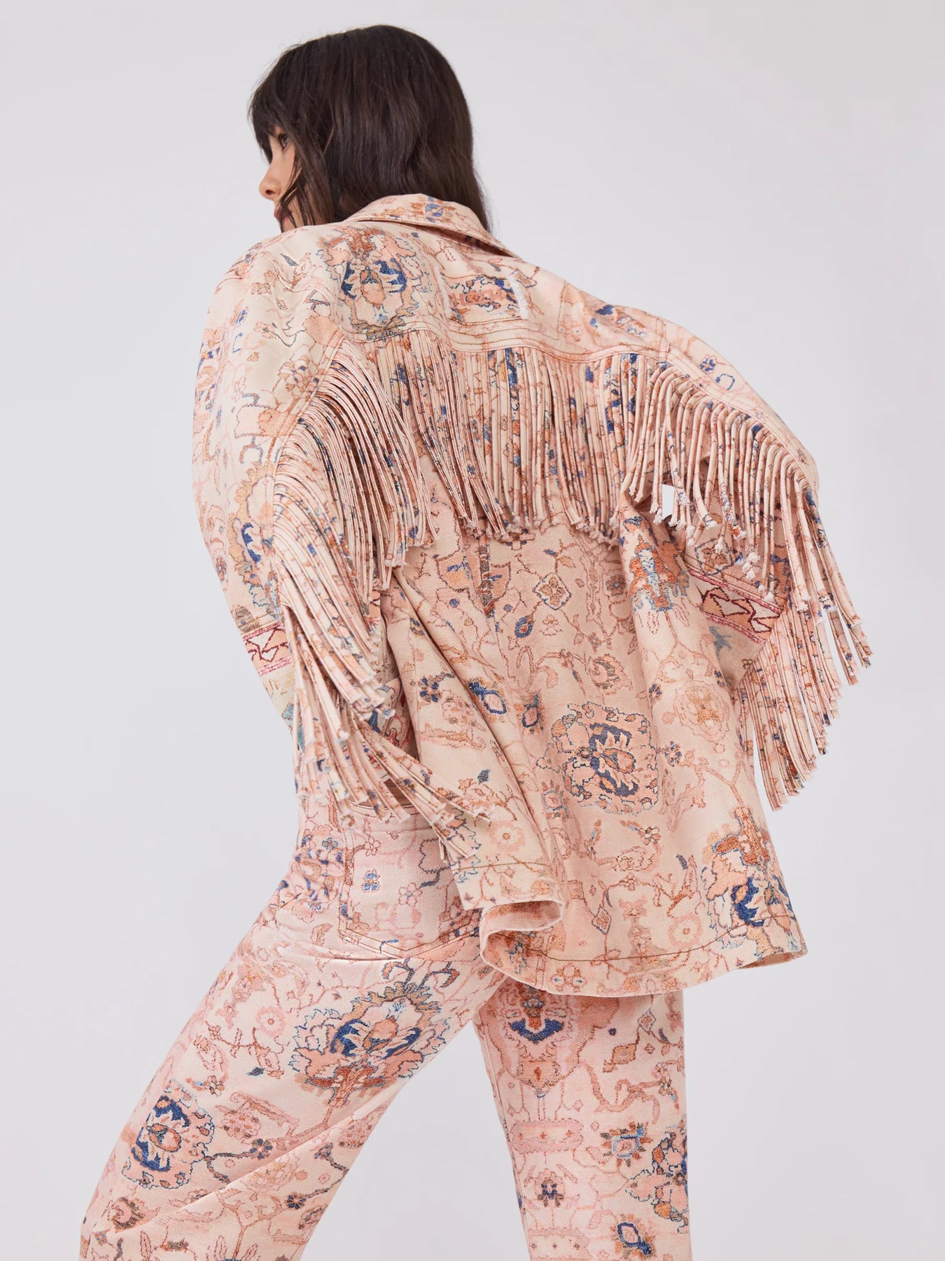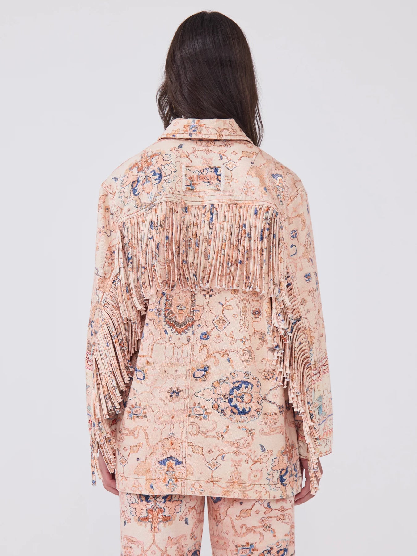 A country classic reimagined through a western lens, this printed barn jacket is detailed with a carpet-inspired placement print and finished with sweeping fringing from the cuffs, up the sleeves and across the back. Patch pockets keep it practical, studs add cool, while the relaxed fit makes it an easy layer to throw over denim, dresses or knits.