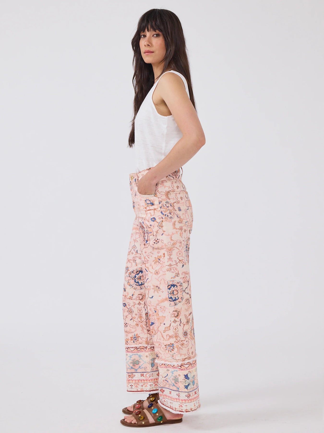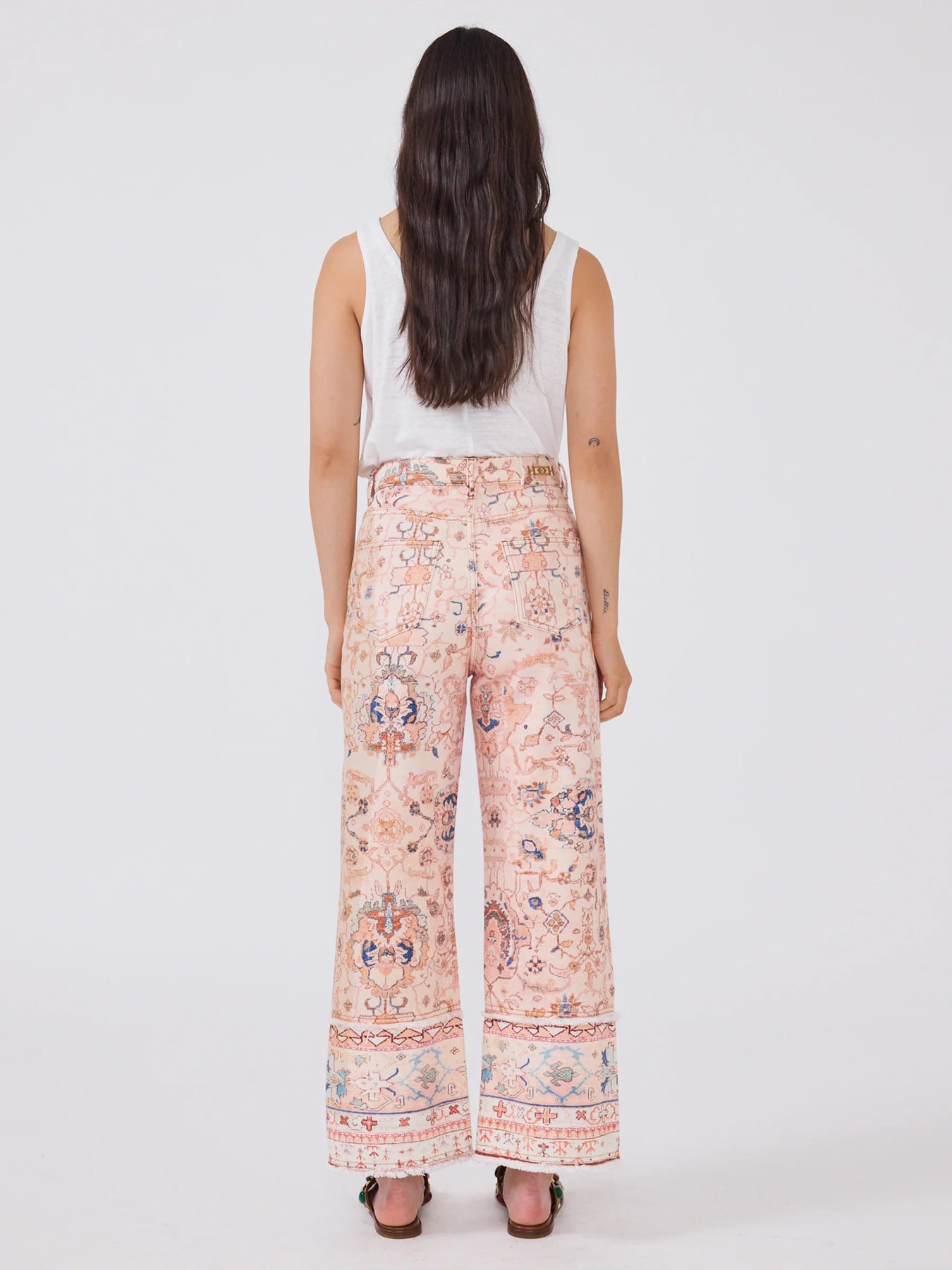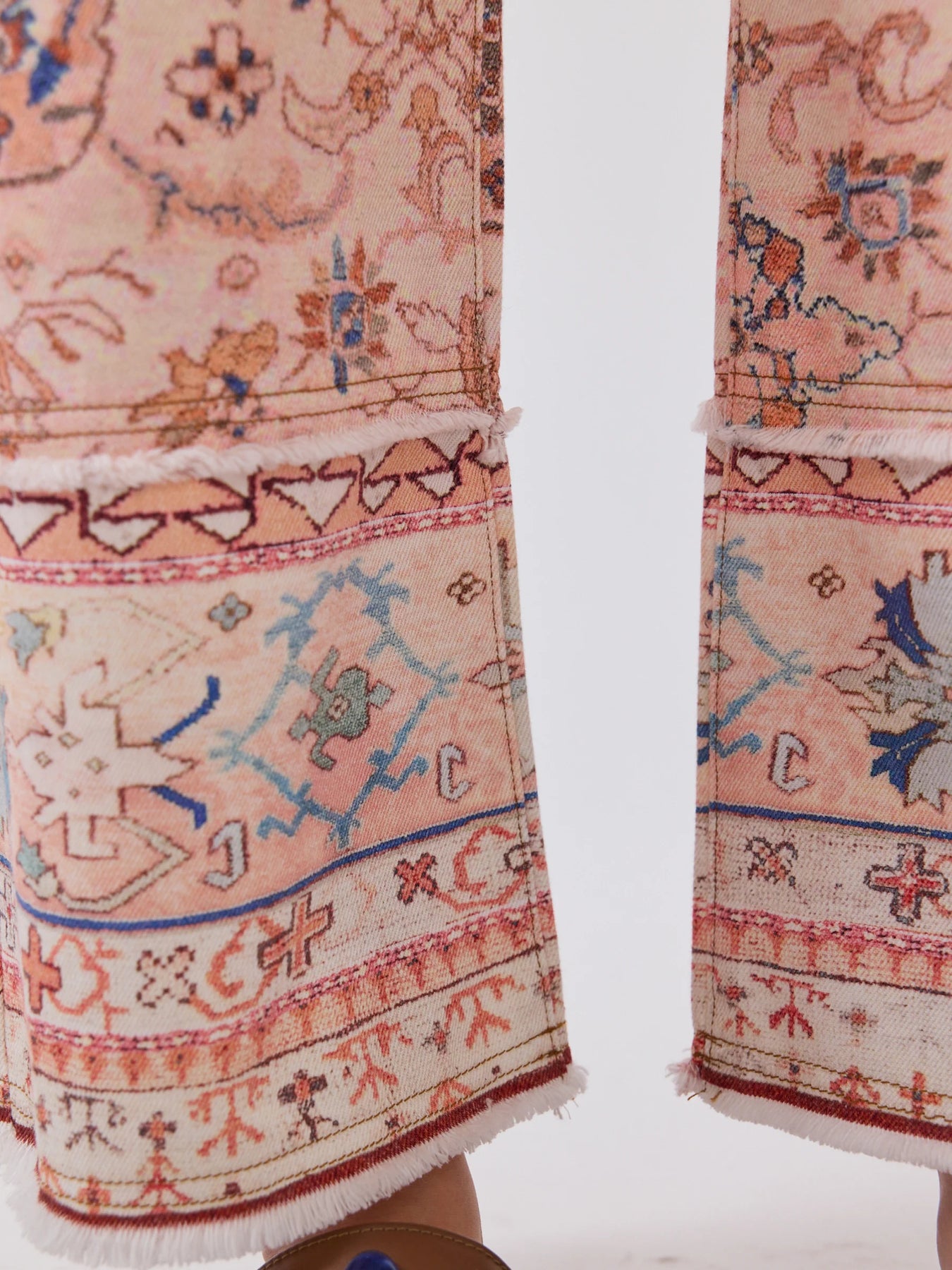 Denim done differently, these wide-leg pink jeans are cropped with a raw-edge hem and finished with subtle hem detailing for a worn-in, sun-kissed look. Featuring an all-over print inspired by vintage carpets, style with a simple tee or the matching barn jacket for a full impact look.