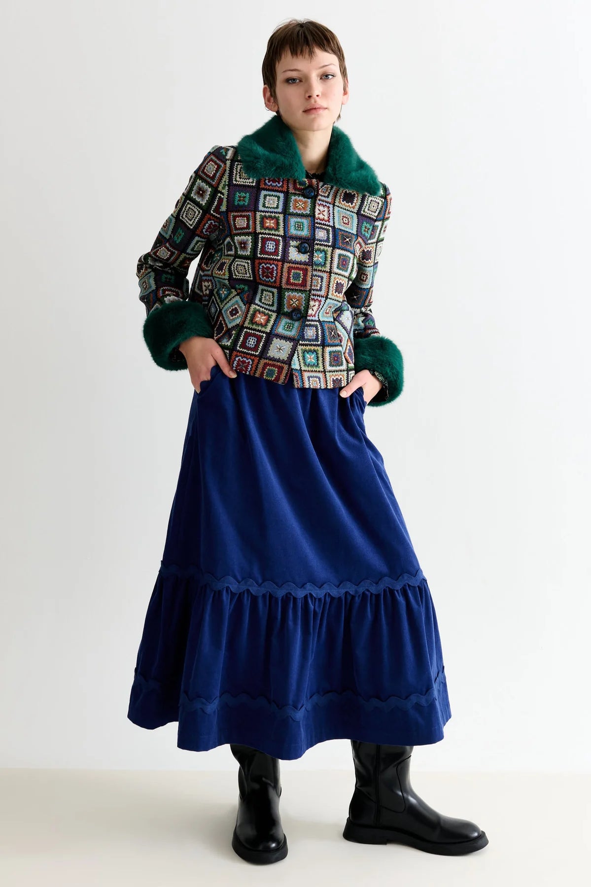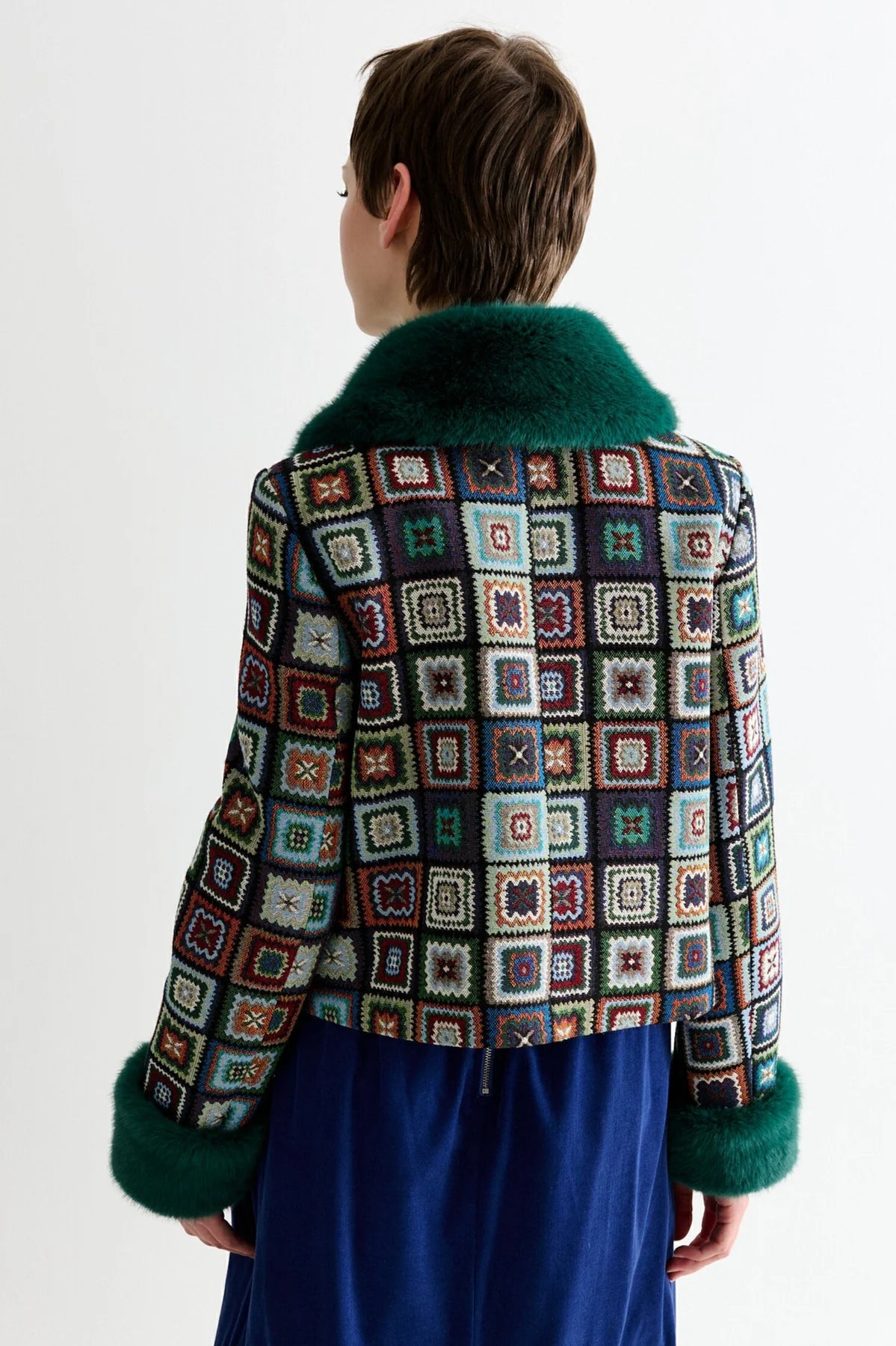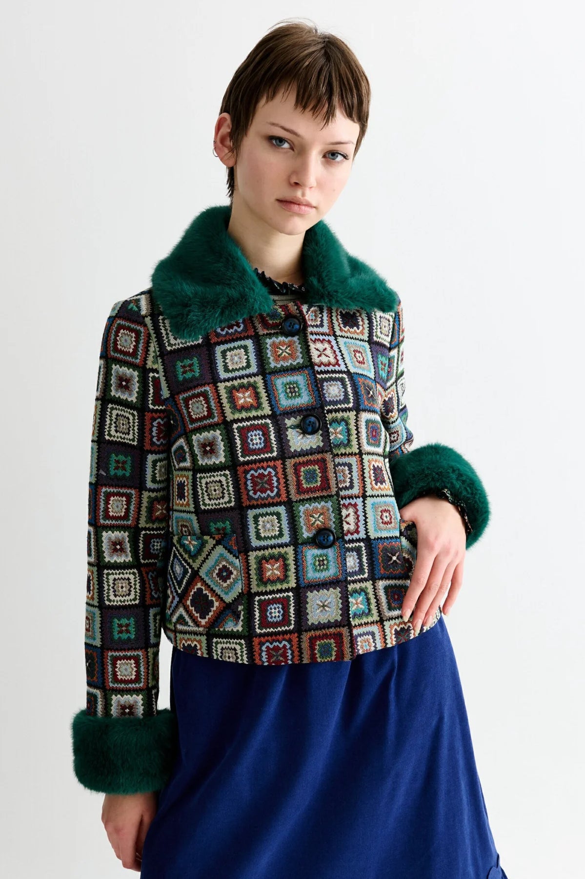 Kent 70's Patch Jacquard Fur Trim Cropped Jacket