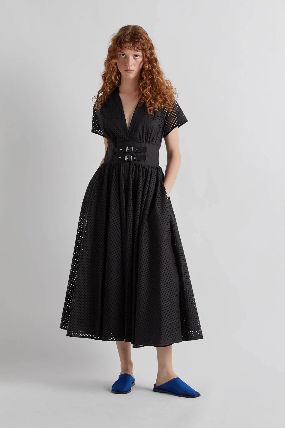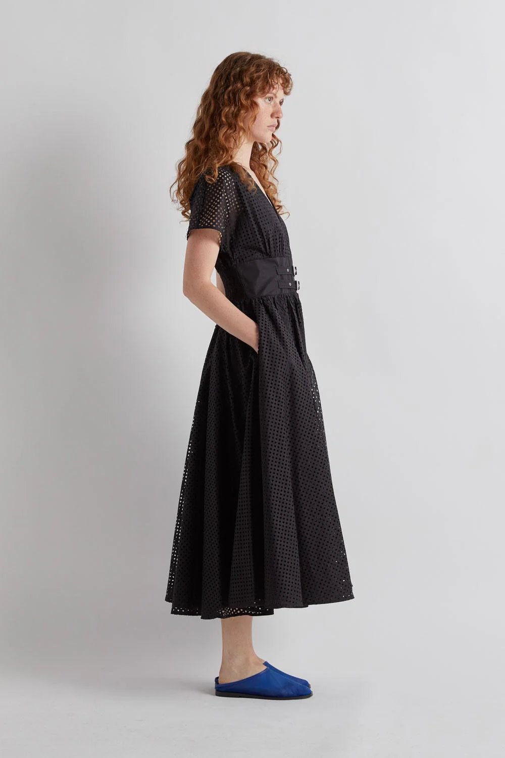 The Meimeij ‘Siena’ Dress in black features an all-over laser cut circle design, creating a mesh effect that enhances breathability. Constructed from cotton, it includes a v-neck and cap sleeves and the skirt is fully lined for a refined silhouette. The elasticated back ensures a comfortable fit, while the double buckle detail adds an elegant touch.