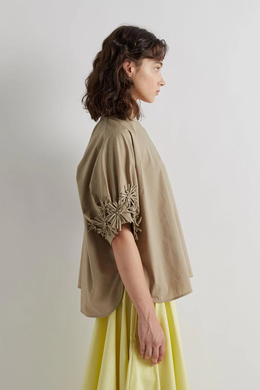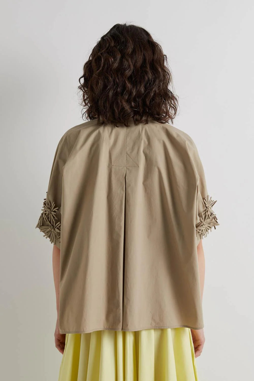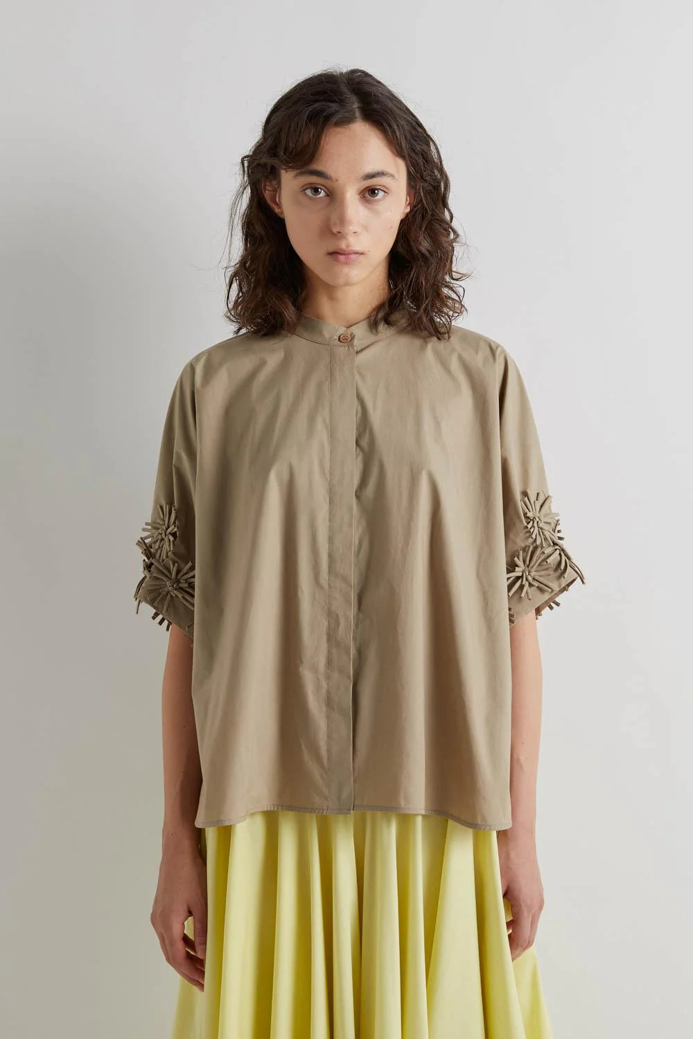 Crisp cool cotton shirt in Neutral Travertine. Short sleeve with concealed button through front, appliquéd flower detail on arms.