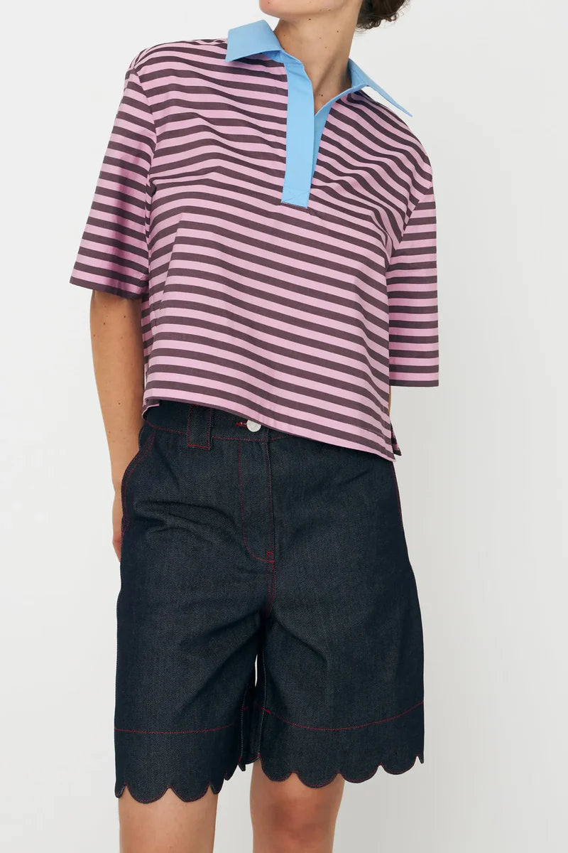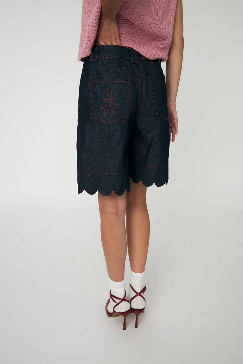 Mid-waisted denim shorts with scallop edges, side and back patch pockets, and belt loops. They are closed with a button and a zipper.