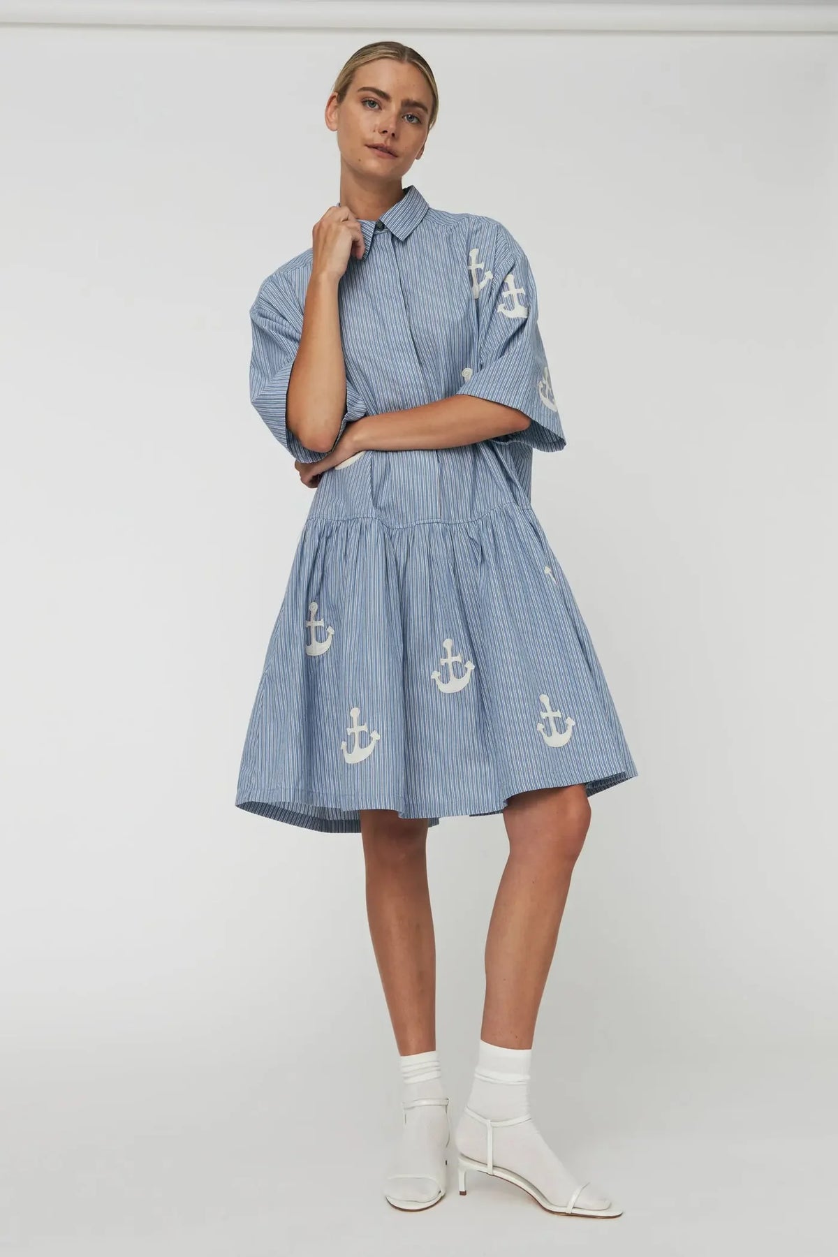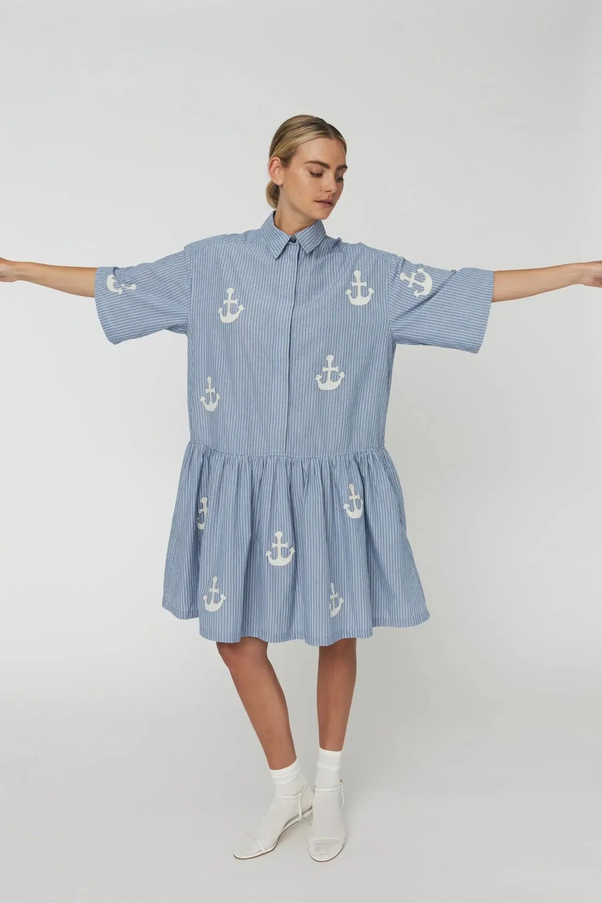 Midi dress in cotton striped fabric with embroidered anchors. It features a classic shirt collar and a concealed button closure at the front. The dress has short sleeves and a loose fit with a waist seam that adds volume to the skirt.